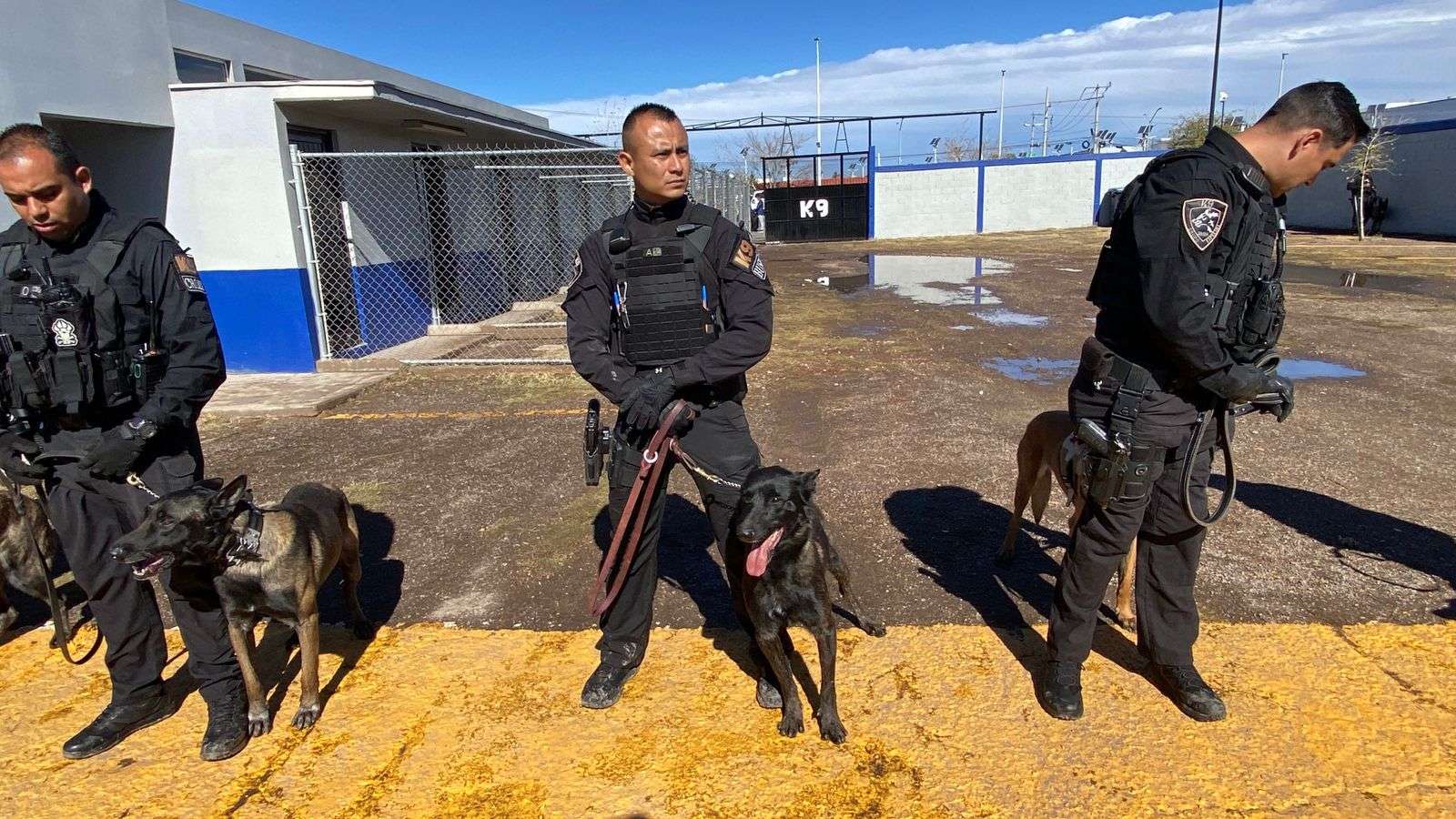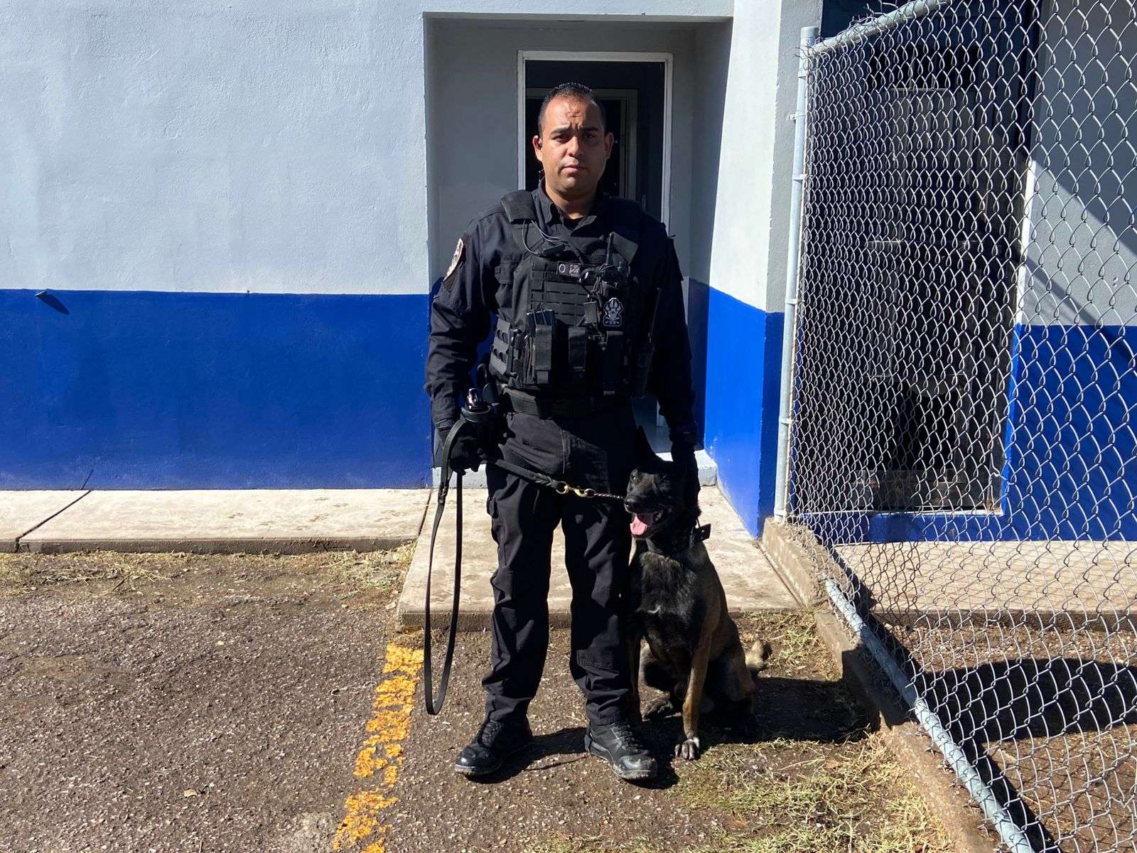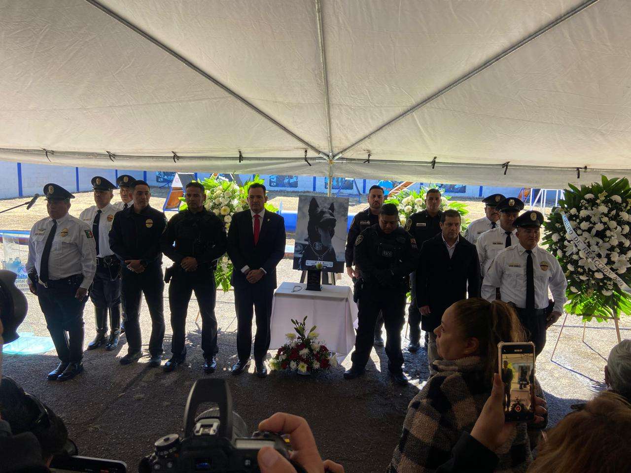 Chihuahua.- En las instalaciones de entrenamiento de los elementos caninos del grupo K-9, el alcalde Marco Antonio Bonilla Mendoza encabezó los honores póstumos a Vico, el elemento canino que murió en cumplimiento de su deber después de seis años de servicio.