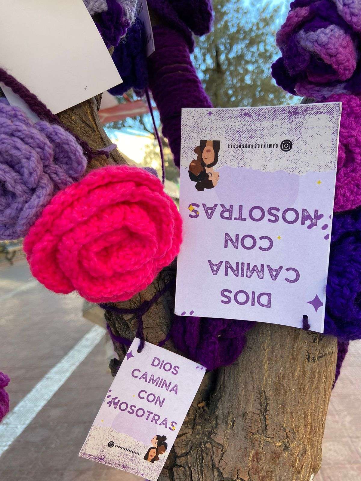 Así mismo, entre estos adornos posan pequeños carteles con frases como, “Dios camina con nosotras” y “Dios es amor no violencia”.