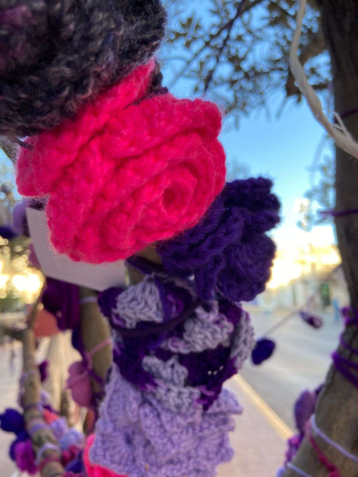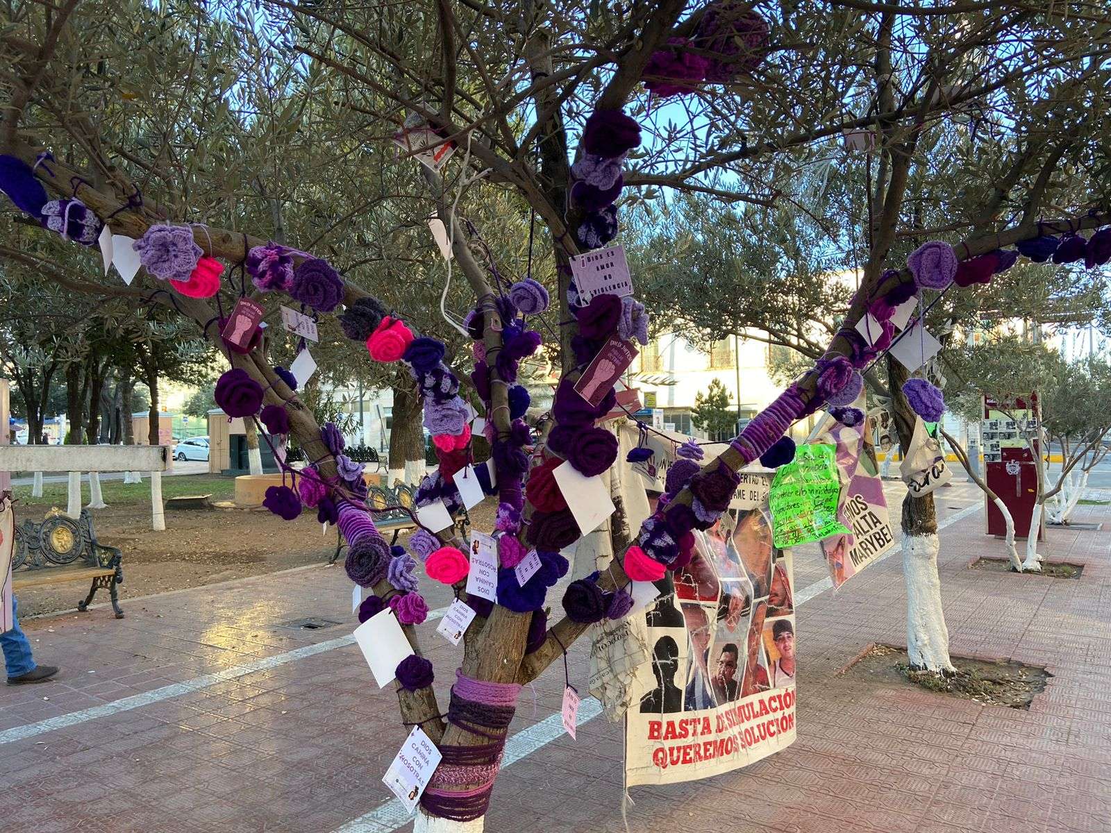 Chihuahua, Chih.- Esta mañana en la Plaza Hidalgo un árbol fue adornado con docenas de rosas hechas de estambre en colores morados y rojos, por parte de un nuevo movimiento feminista.