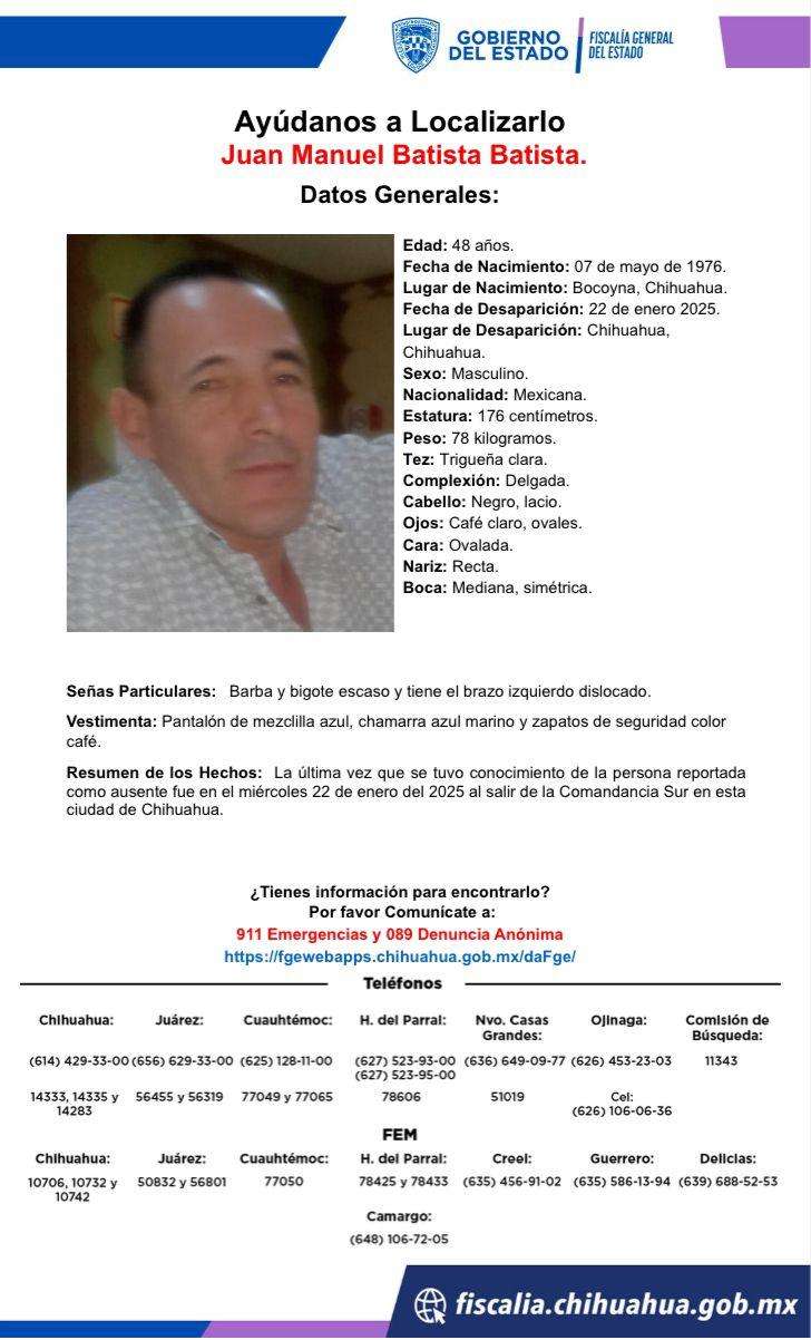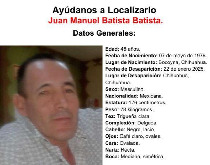 Chihuahua.- Juan Manuel Batista Batista, de 48 años, desapareció desde el pasado 22 de enero en la ciudad de Chihuahua.