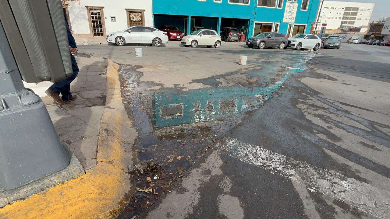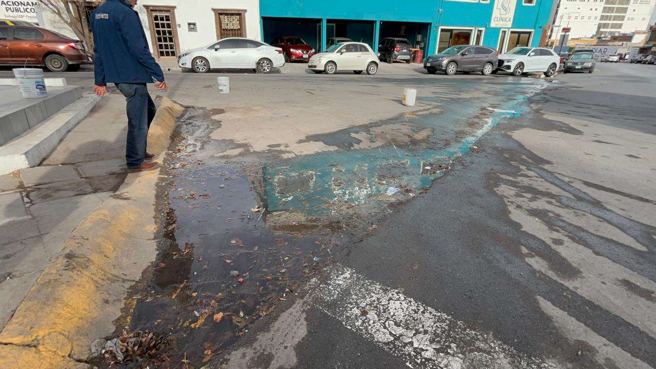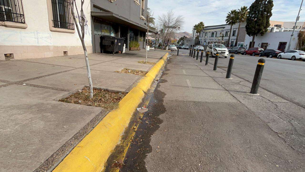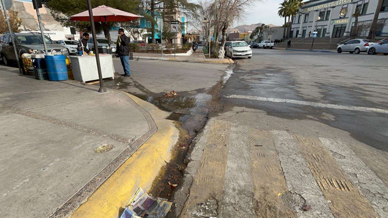 Chihuahua.- Miles de litros de agua potable se desperdician diariamente debido a una fuga que se filtra por la calle en pleno centro de la ciudad.