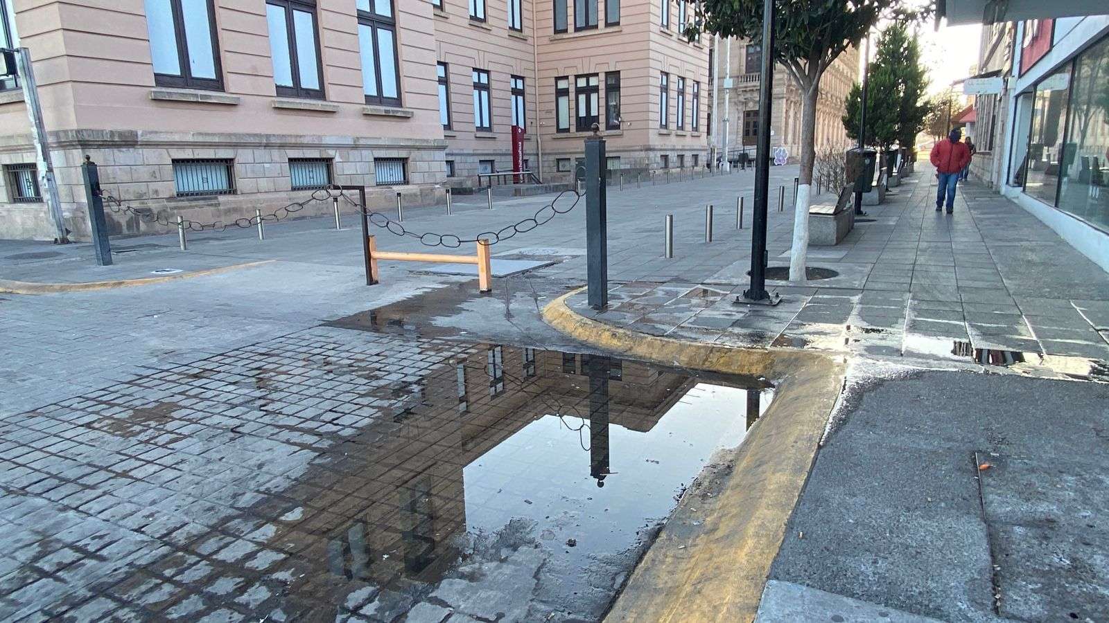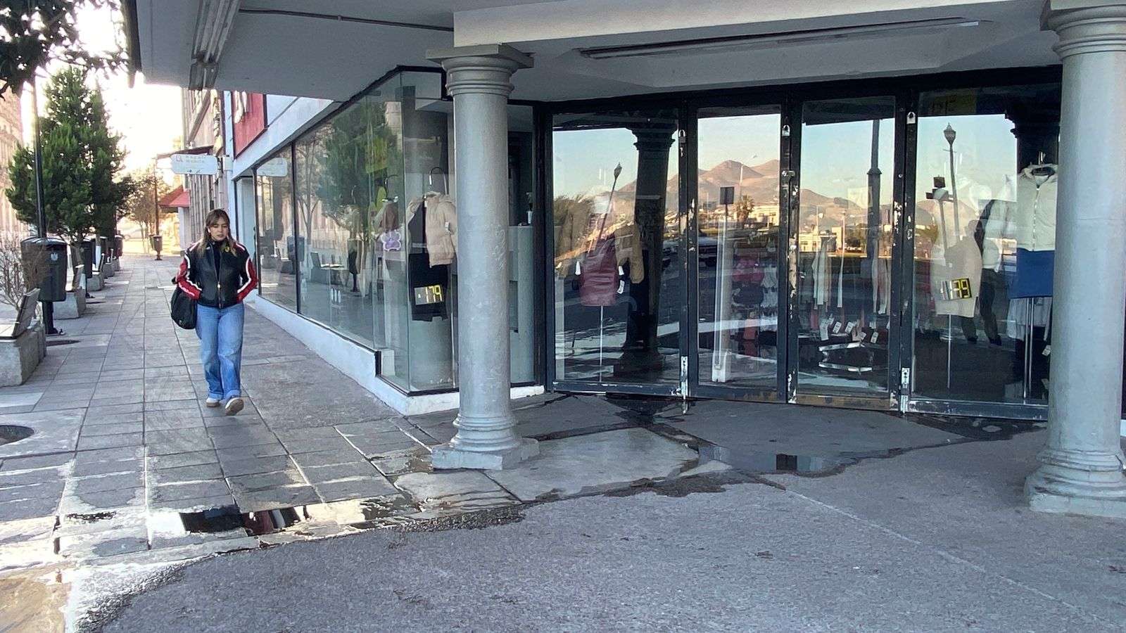 Chihuahua.- Una considerable fuga de agua se registró esta mañana en una tienda de ropa ubicada en la intersección de la calle Guerrero y la avenida Juárez, en la colonia centro.