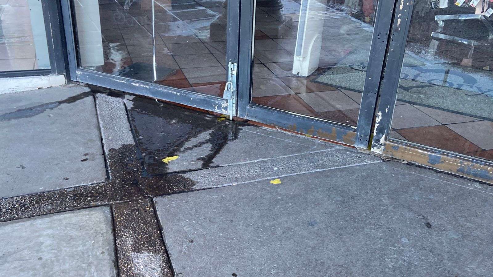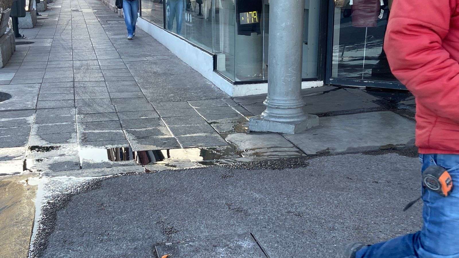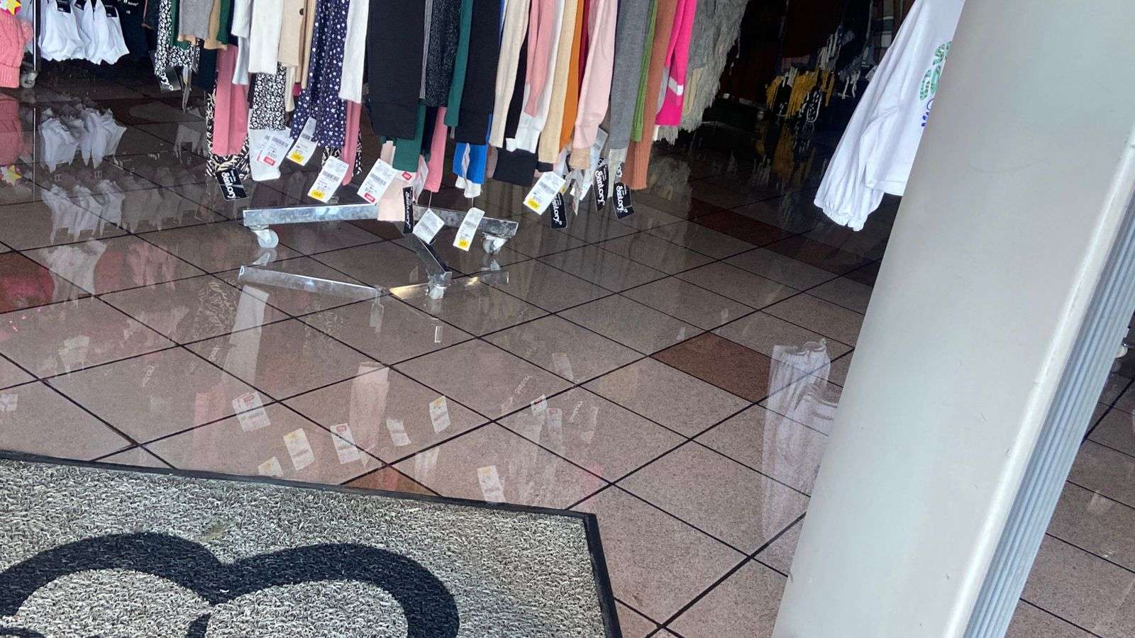El interior del establecimiento se encontraba completamente inundado, mientras que en el exterior el agua corría misma que formó un charco donde el agua corría hacia la alcantarilla que se encuentra sobre la calle Guerrero.