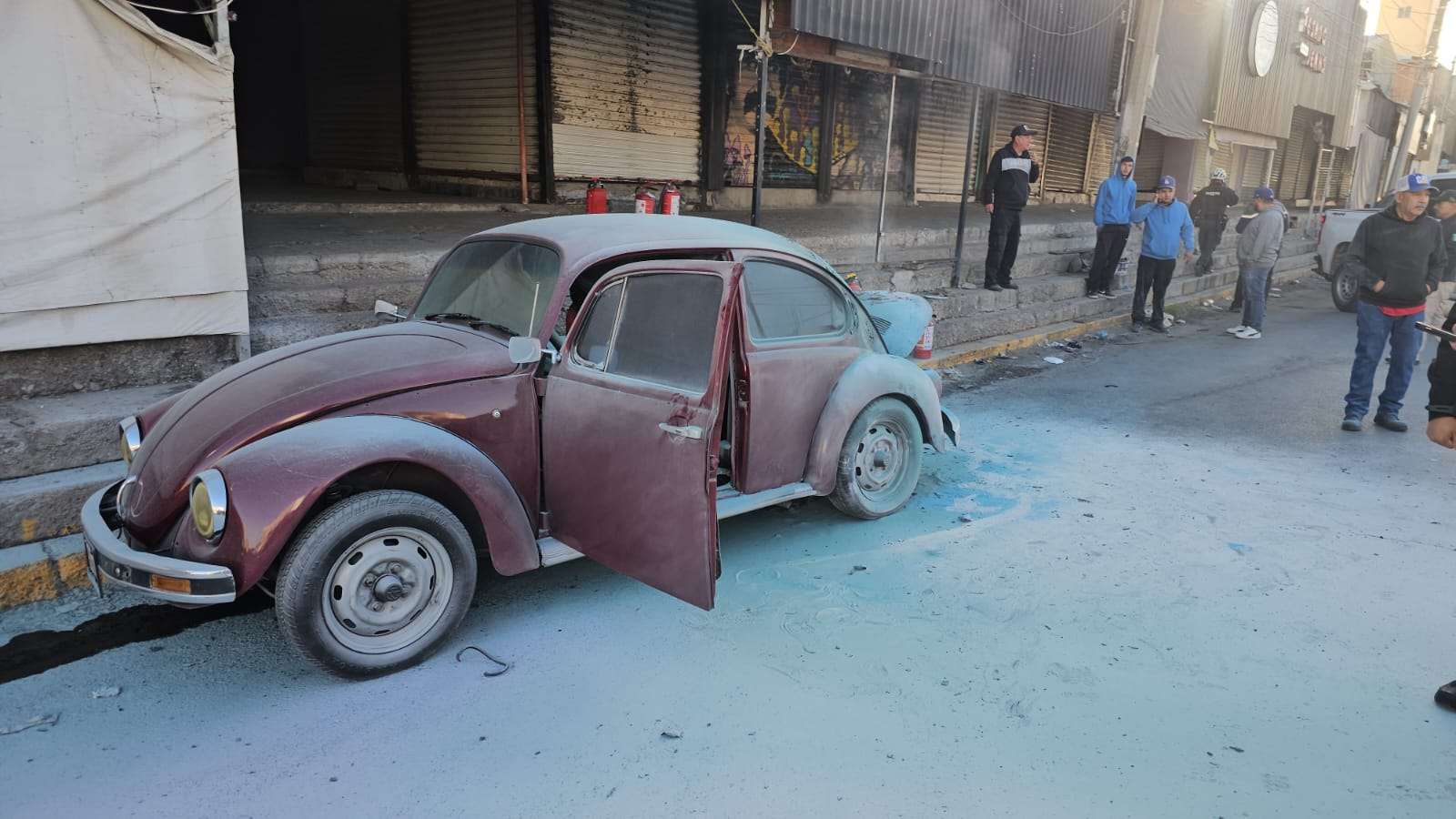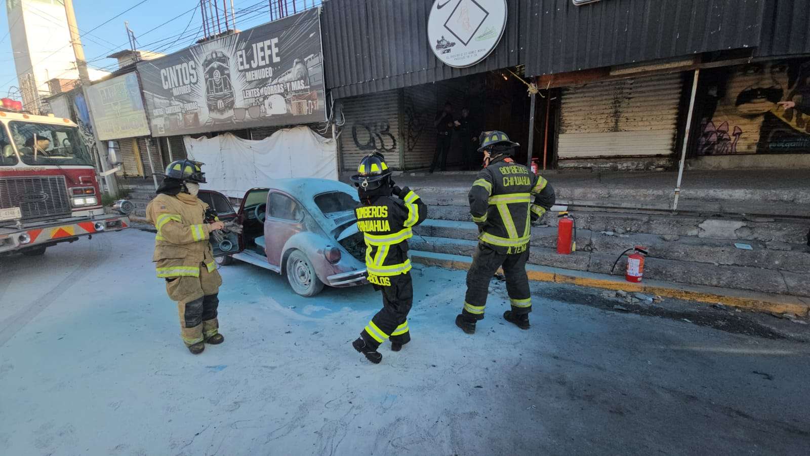Chihuahua.- Un vehículo Volkswagen tipo vocho se incendió sobre la calle Gómez Morín, en su cruce con Libertad, en la colonia Centro, cerca de la zona de El Pasito.