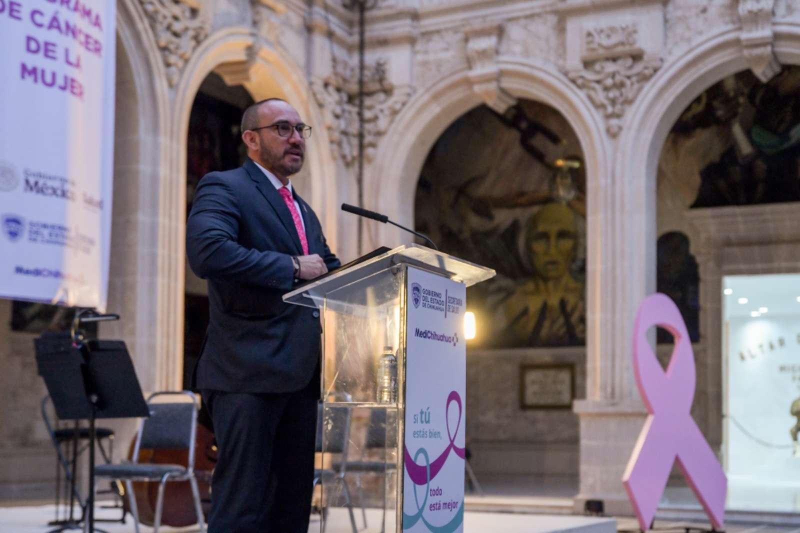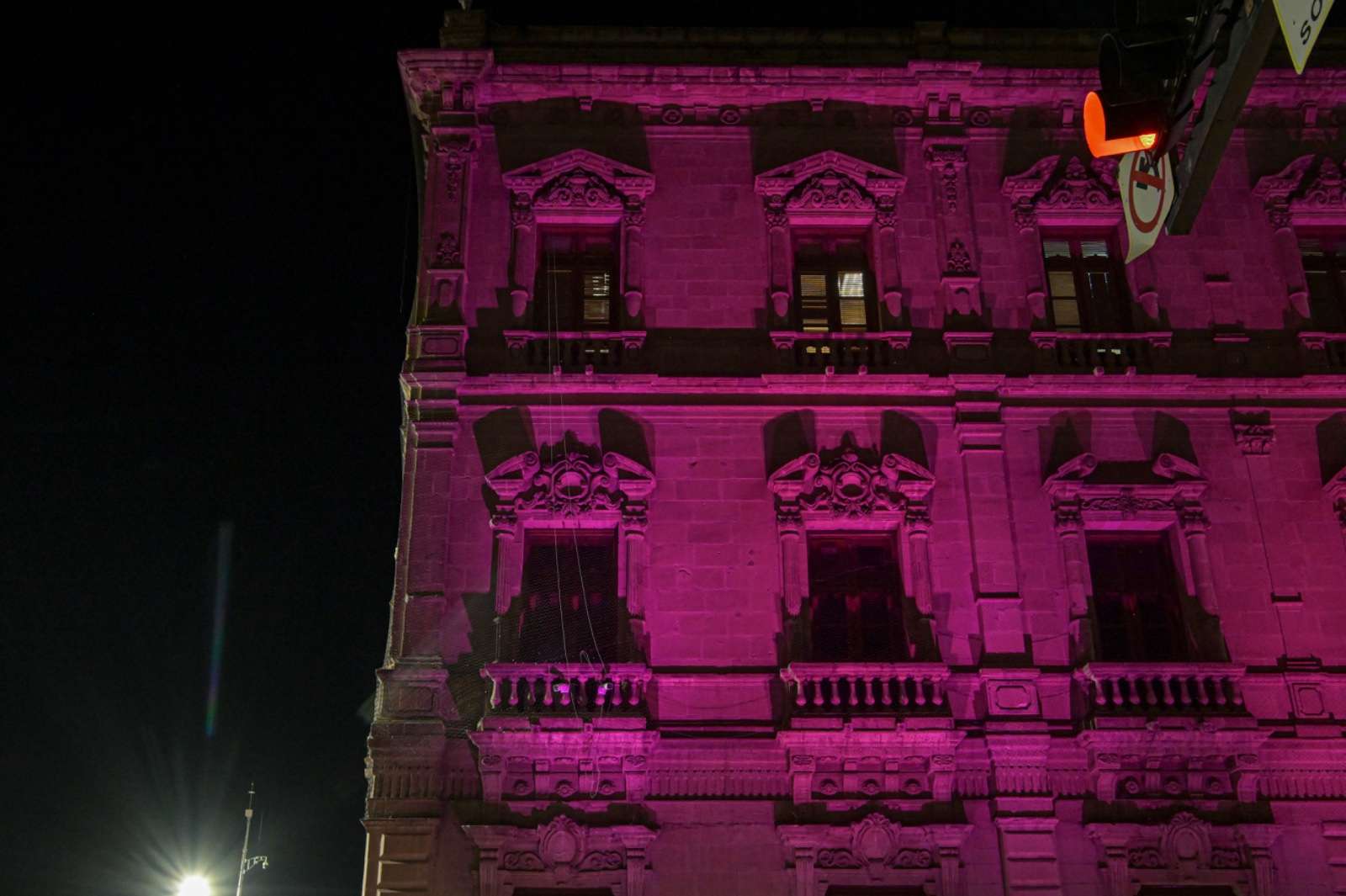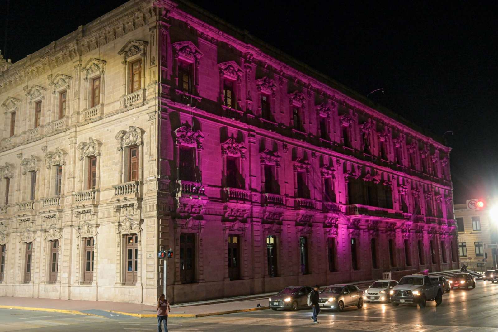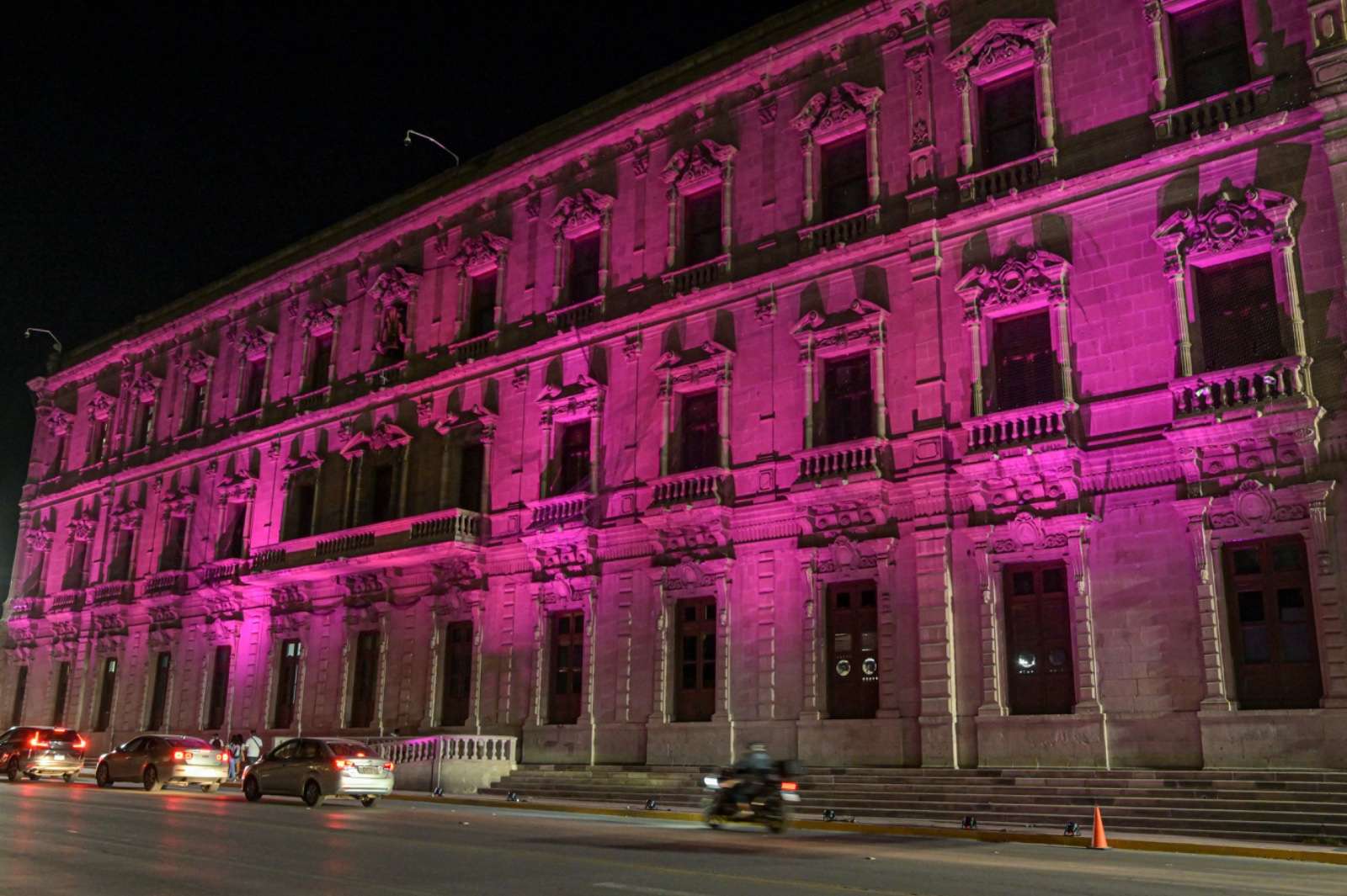 Chihuahua.- En el mes de la sensibilización y lucha contra el cáncer de mama, y el cáncer cervicouterino, el Palacio de Gobierno fue iluminado de rosa, en atención al compromiso asumido por el Estado a favor de la salud de las mujeres chihuahuenses.