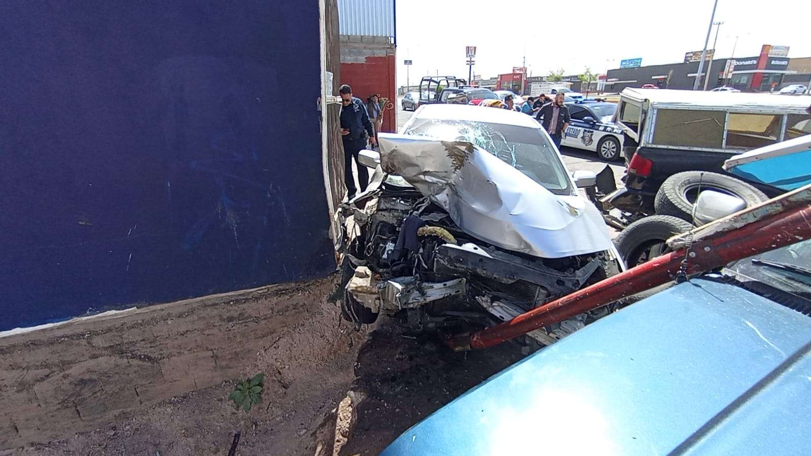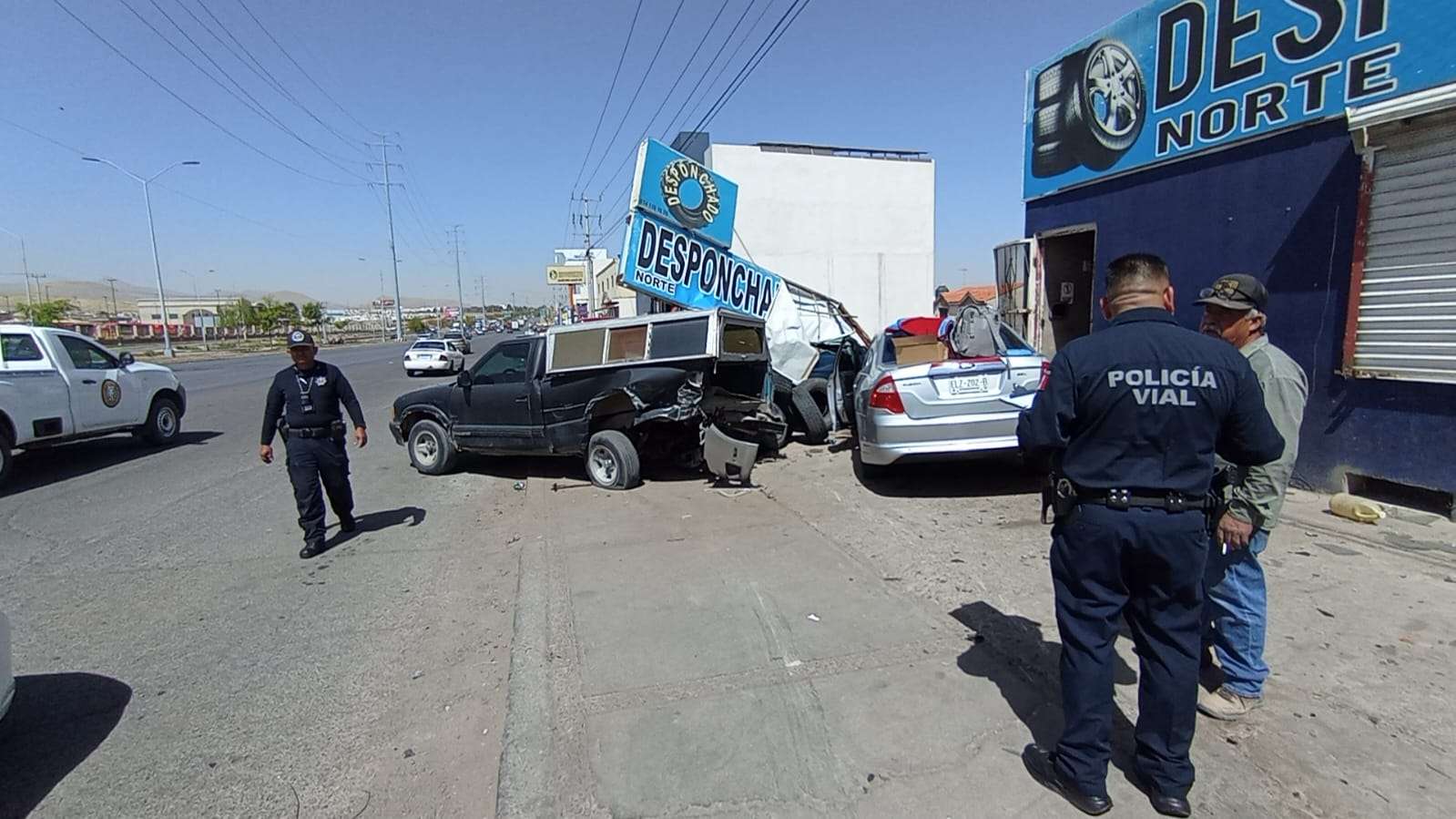 Durante el impacto, las unidades chocaron contra un anuncio del desponchado, donde el trabajador realizaba labores mecánicas, por lo que fue atropellado y cayó a un barranco de aproximadamente tres metros de profundidad. En el lugar también resultó con daños una pickup GMC Sierra estacionada.