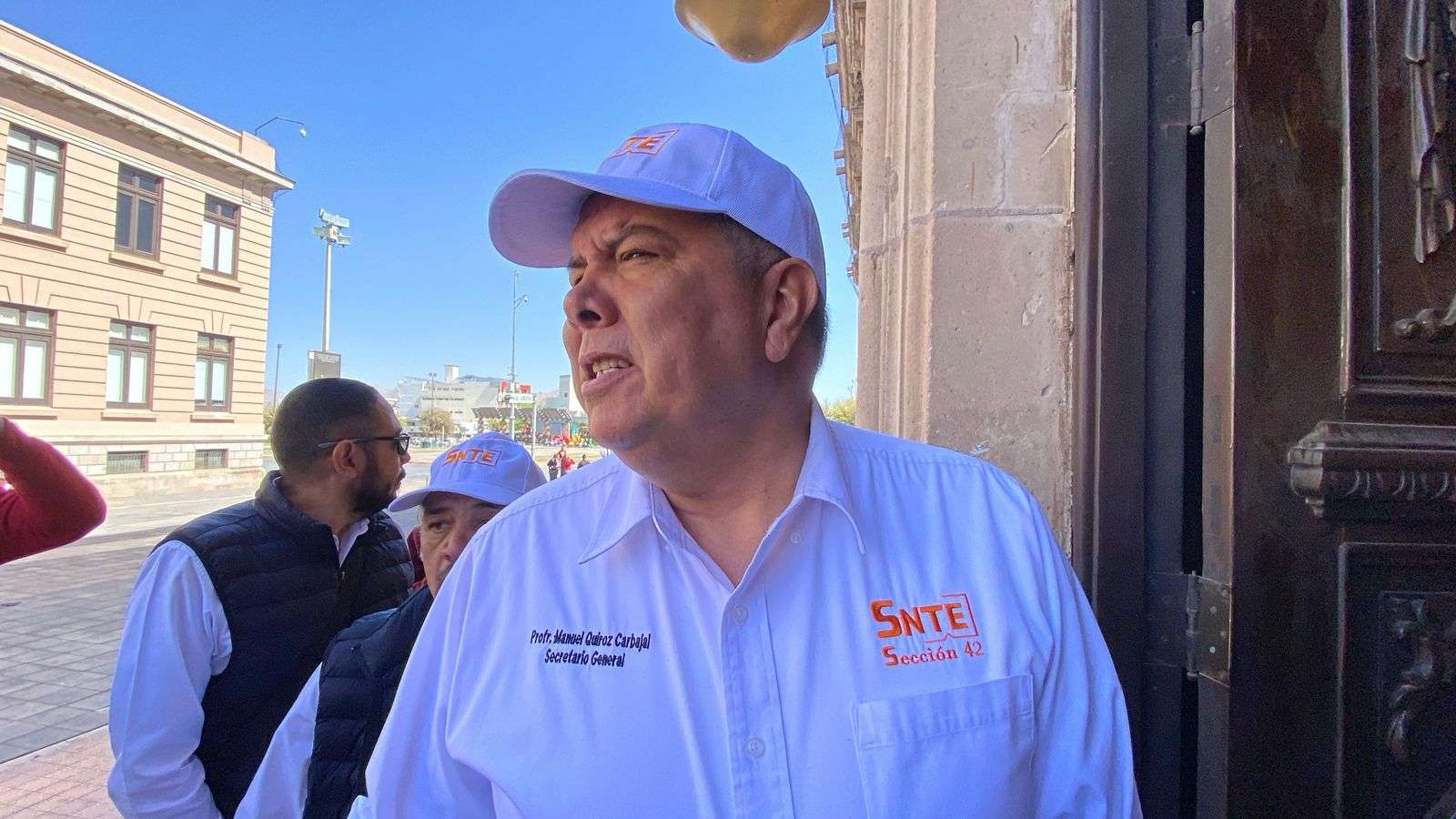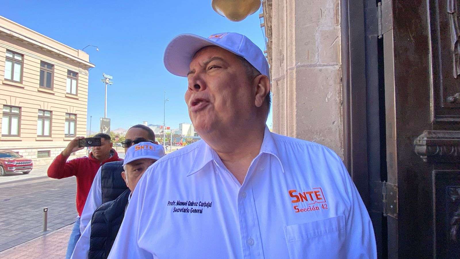 Chihuahua.- El Secretario General de la Sección 42 del SNTE, Manuel Quiroz Carbajal, arribó a Palacio de Gobierno para sostener una reunión con el secretario de Educación y Deporte, Hugo Gutiérrez Dávila, y con el Secretario de Hacienda, José de Jesús Granillo, para exponer las peticiones de los maestros en estos momentos.