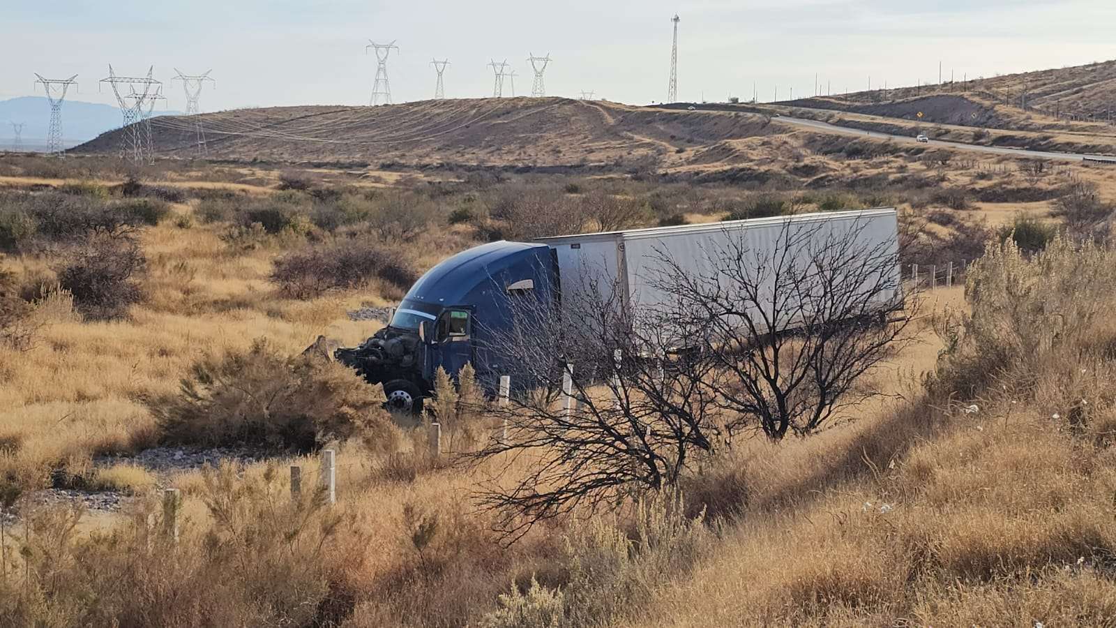 Chihuahua.- Un tráiler que circulaba por la carretera Delicias–Chihuahua se salió del camino luego de que su conductor presuntamente se quedara dormido al volante.