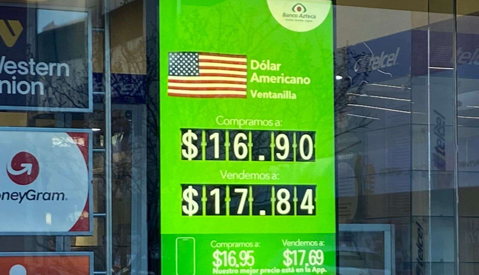 Chihuahua.– El dólar para este sábado 21 de febrero en ventanillas de Banco Azteca, ubicada en la calle Cuarta y Aldama, fue de $17.84 a la venta y $16.90 a la compra, manteniéndose sin variación.