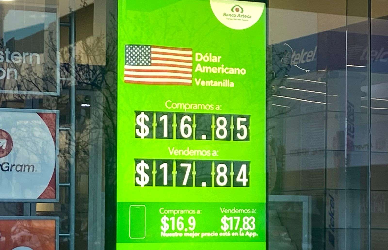 Chihuahua.- Este martes 24 de febrero, en las ventanillas de Banco Azteca, ubicada en la calle Cuarta y Aldama, el dólar se vendió en $17.84 y se compró en $16.85, manteniéndose estable.