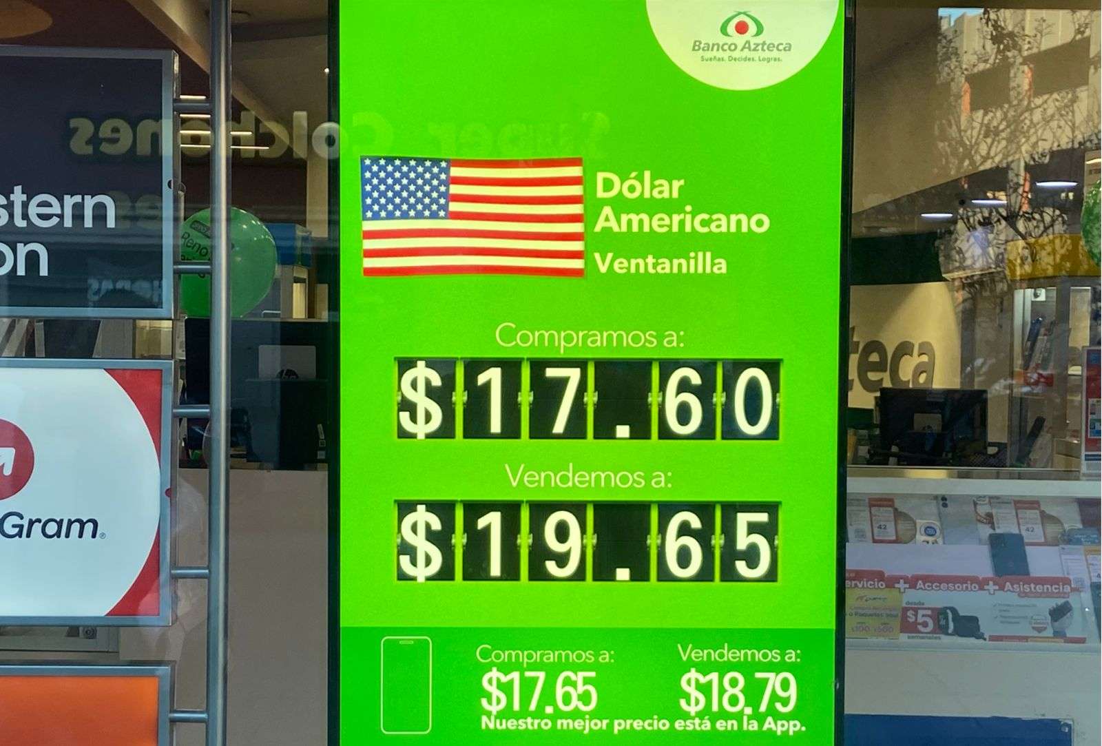 Chihuahua.- El dólar estadounidense cotizó este lunes 22 de diciembre a $19.65 a la venta y $17.60 a la compra en las ventanillas del Banco Azteca, ubicado en la calle Cuarta y Aldama.