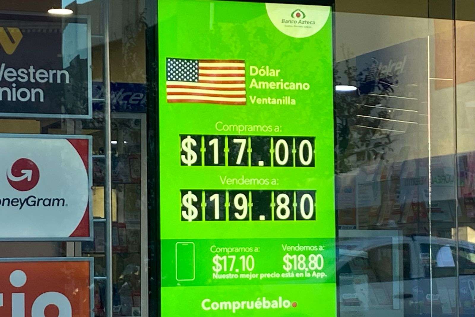 Chihuahua.– El dólar, para este 14 de noviembre, cotizó a $19.80 a la venta y $17.00 a la compra en las ventanillas del Banco Azteca, ubicado en la calle Cuarta y Aldama.