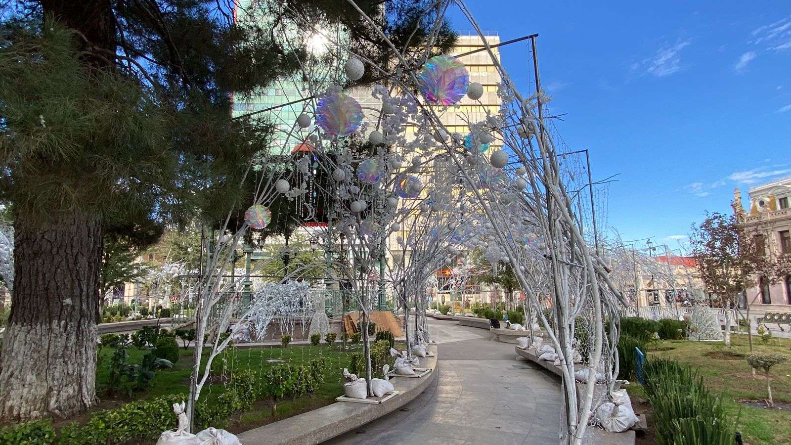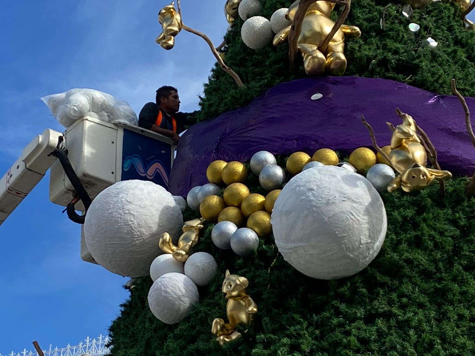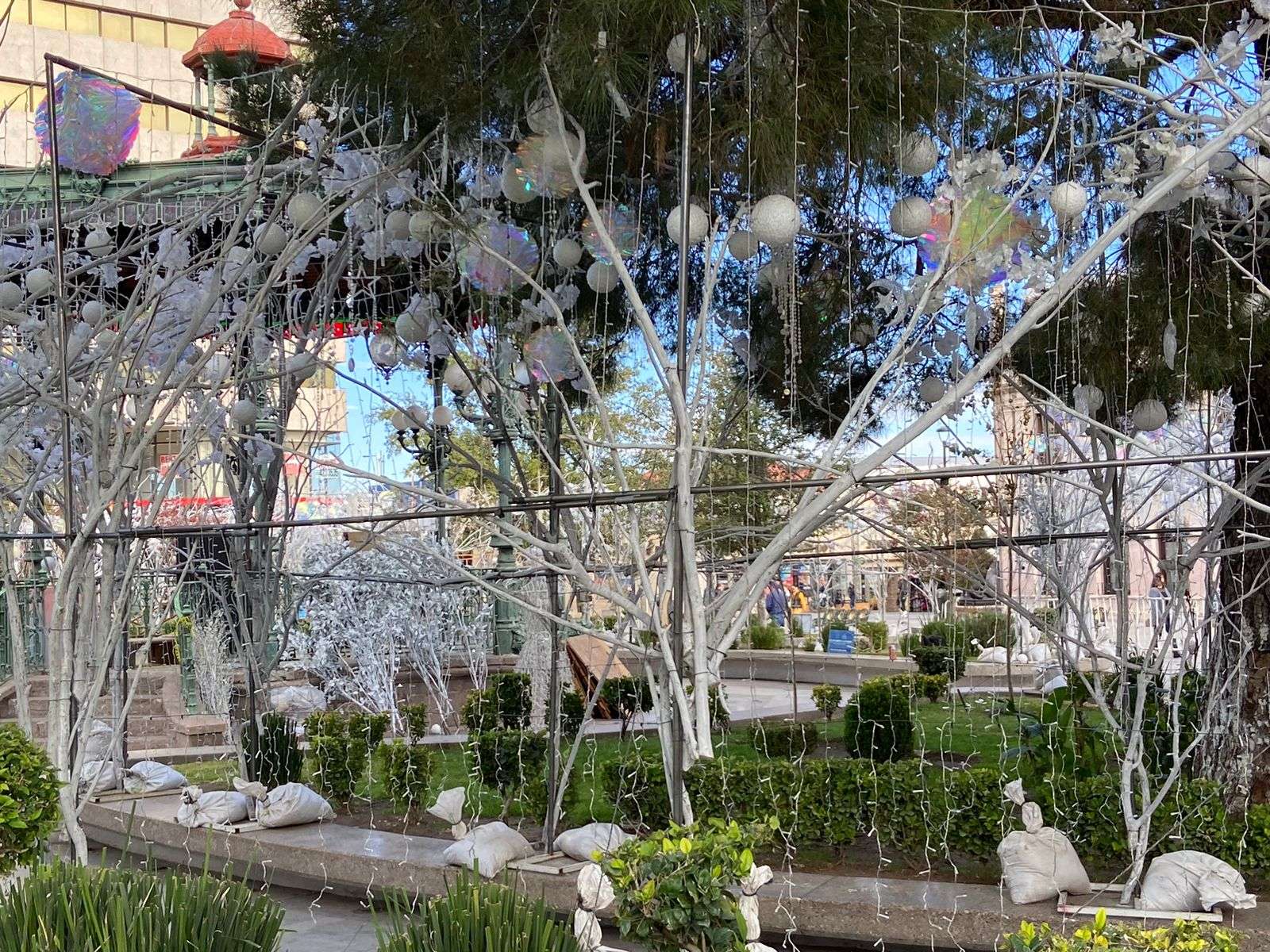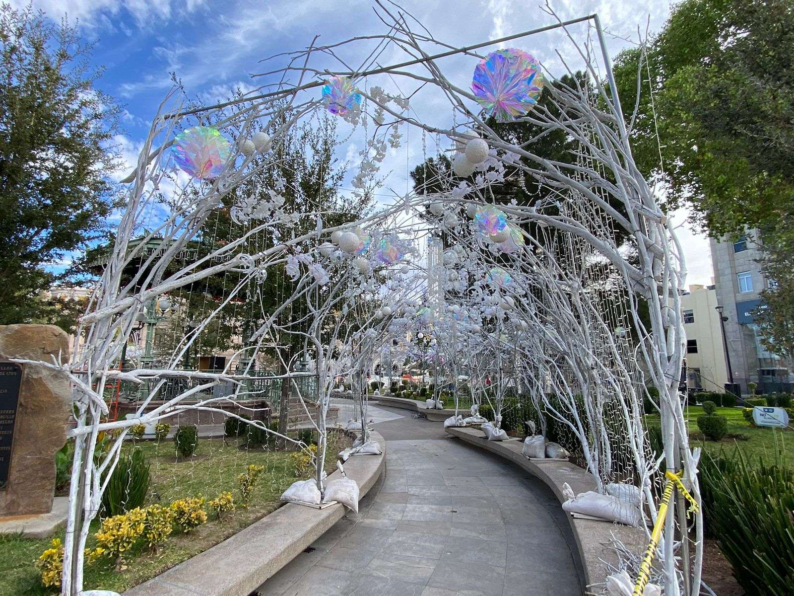 Además, en el área del kiosco se están instalando luces de colores en los árboles, así como arcos de troncos blancos que simulan túneles cubiertos de nieve, acompañados de esferas blancas y multicolores.