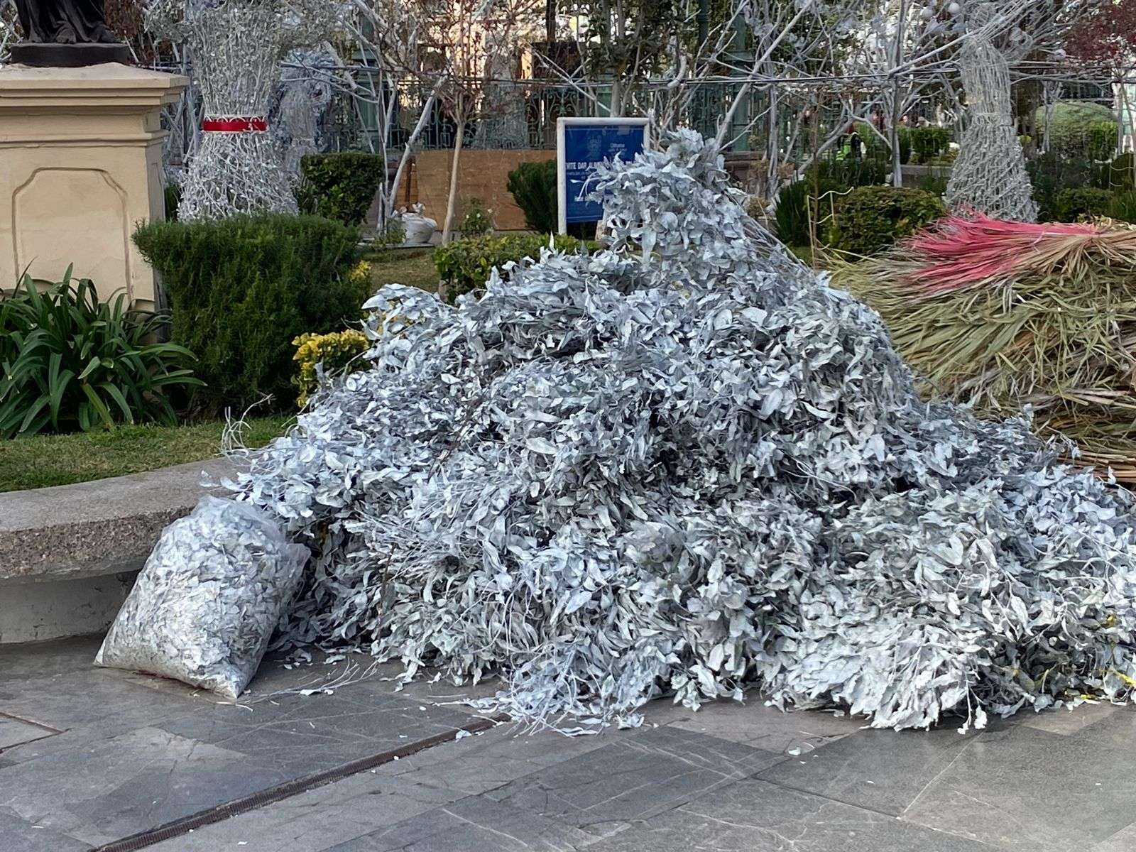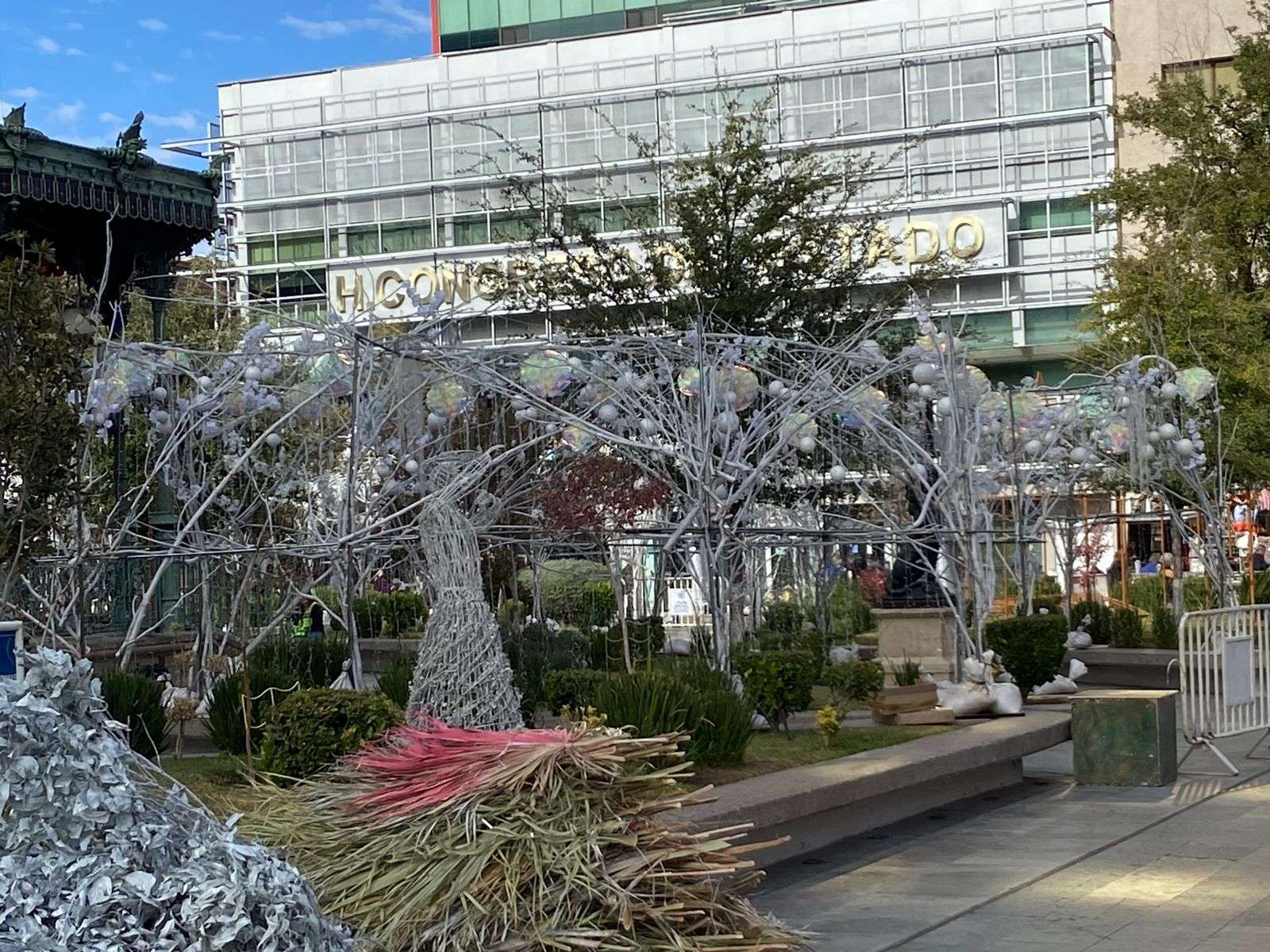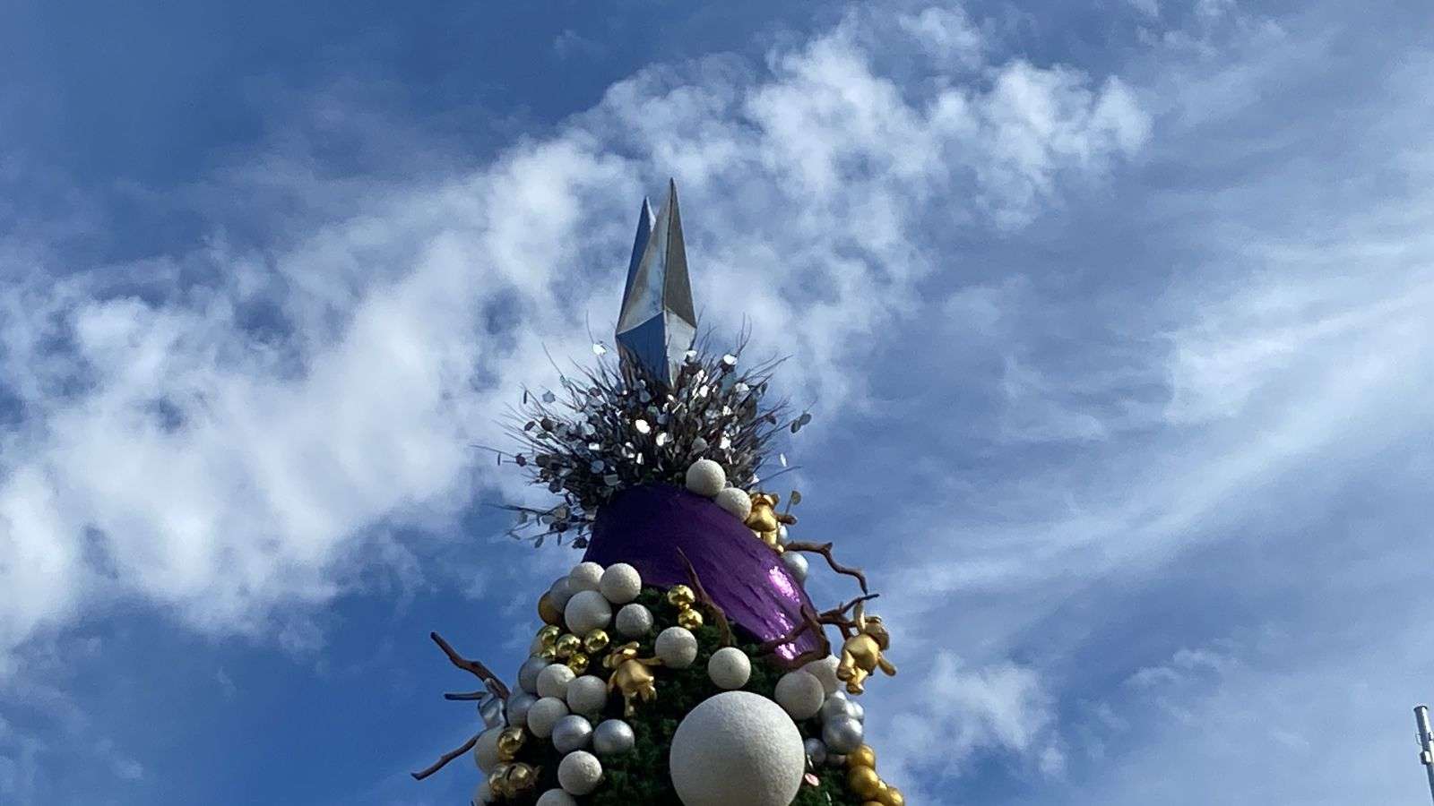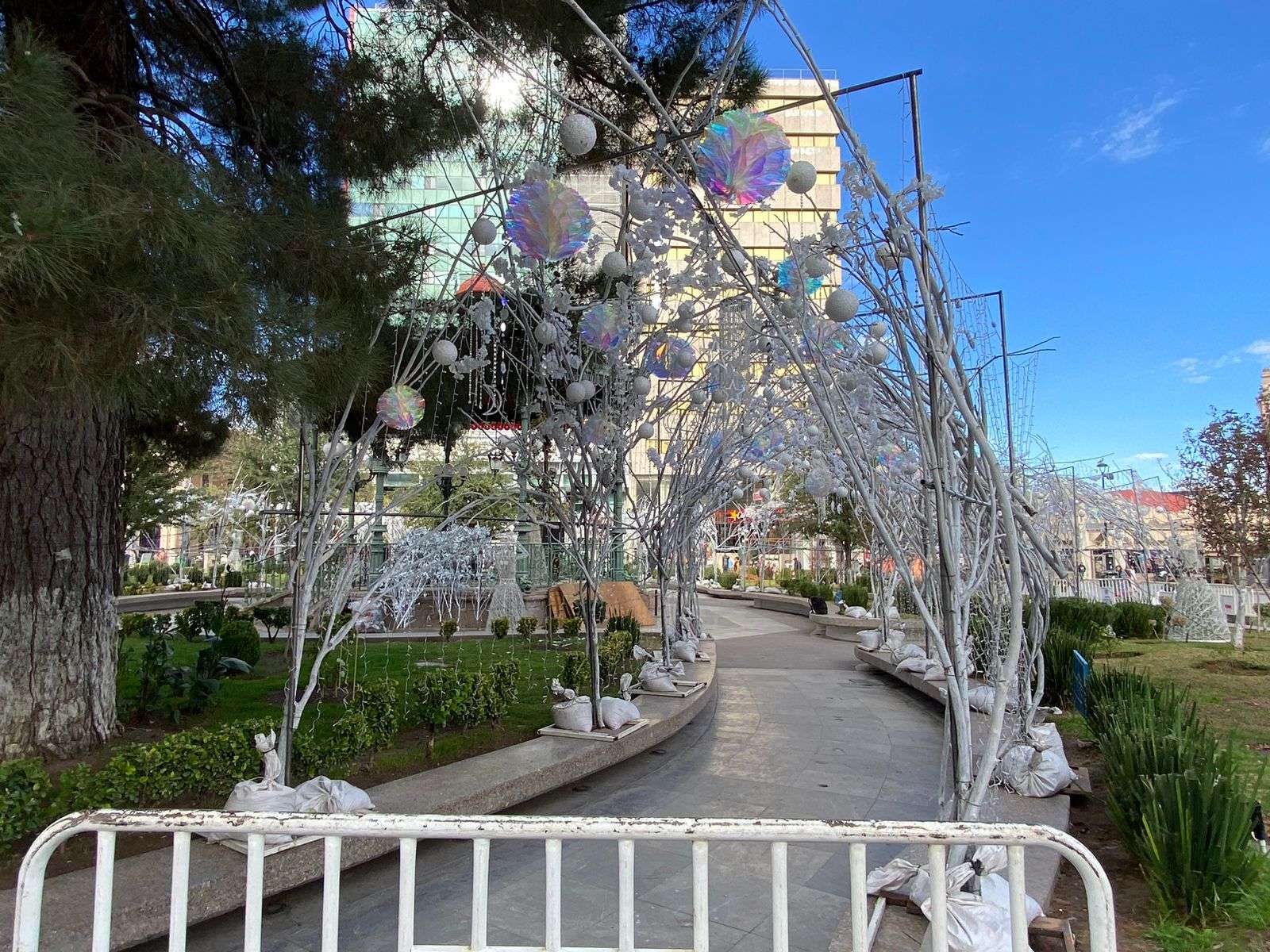 Además, en el área del kiosco se están instalando luces de colores en los árboles, así como arcos de troncos blancos que simulan túneles cubiertos de nieve, acompañados de esferas blancas y multicolores.