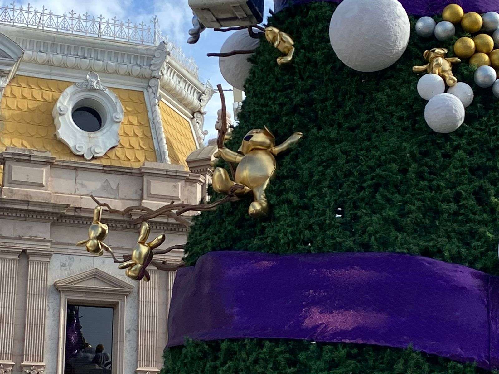 El árbol también se adorna con grandes esferas blancas y medianas en tonos dorados y blancos, así como un festón morado brillante que recorre todo su alrededor.
