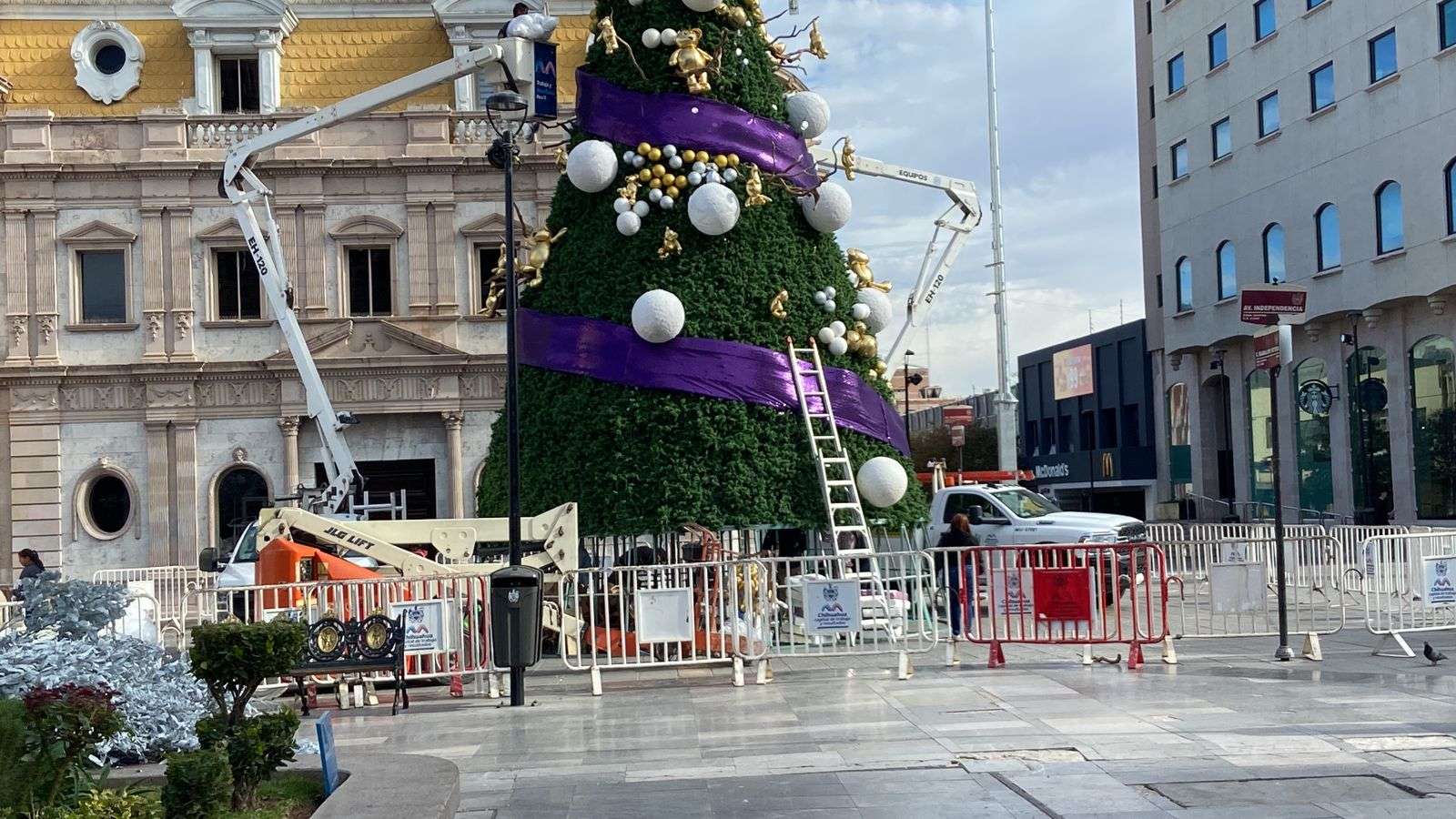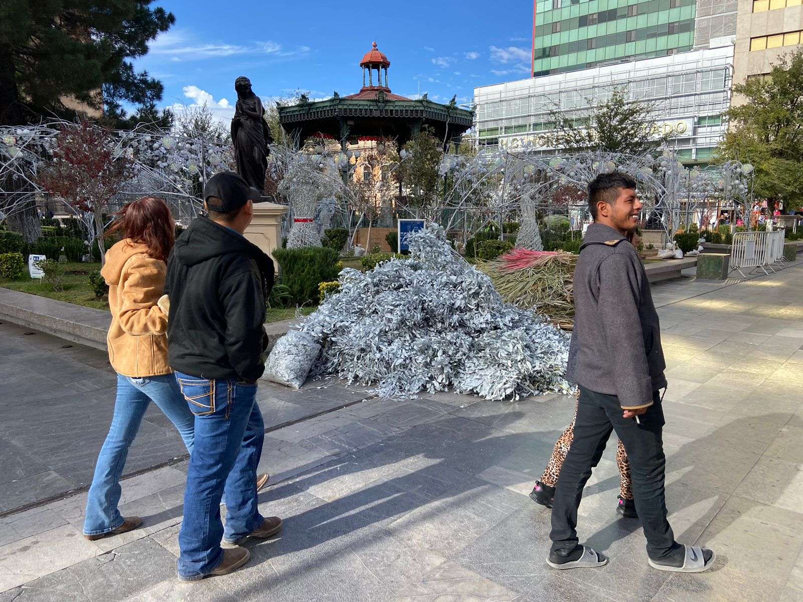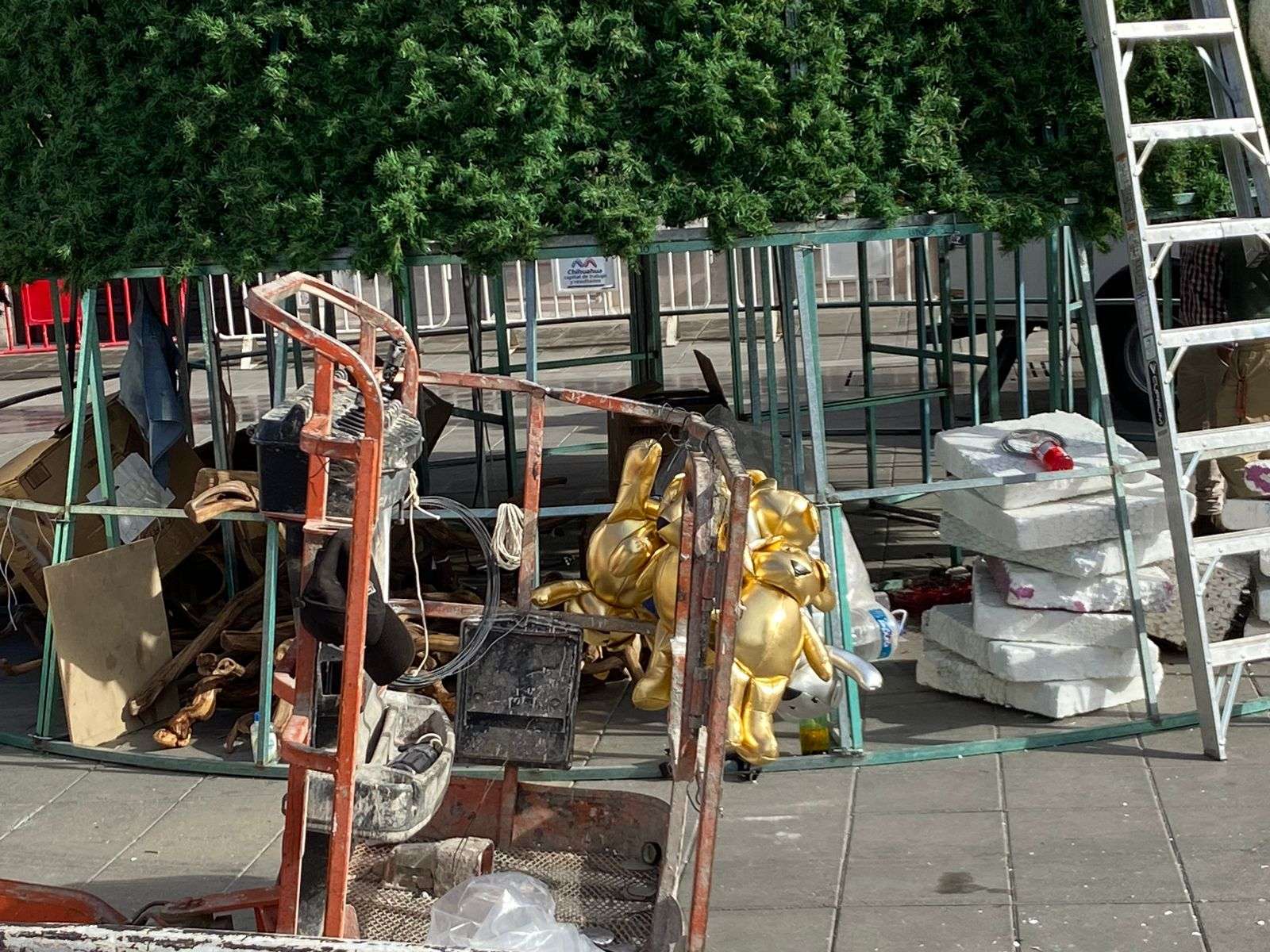 Chihuahua. - Trabajadores siguen con los preparativos para la instalación del Árbol de Navidad en la Plaza de Armas, que este año presenta una serie de decoraciones llamativas. Entre ellas destacan osos de peluche en tonos dorados y troncos secos de los que cuelgan más peluches.