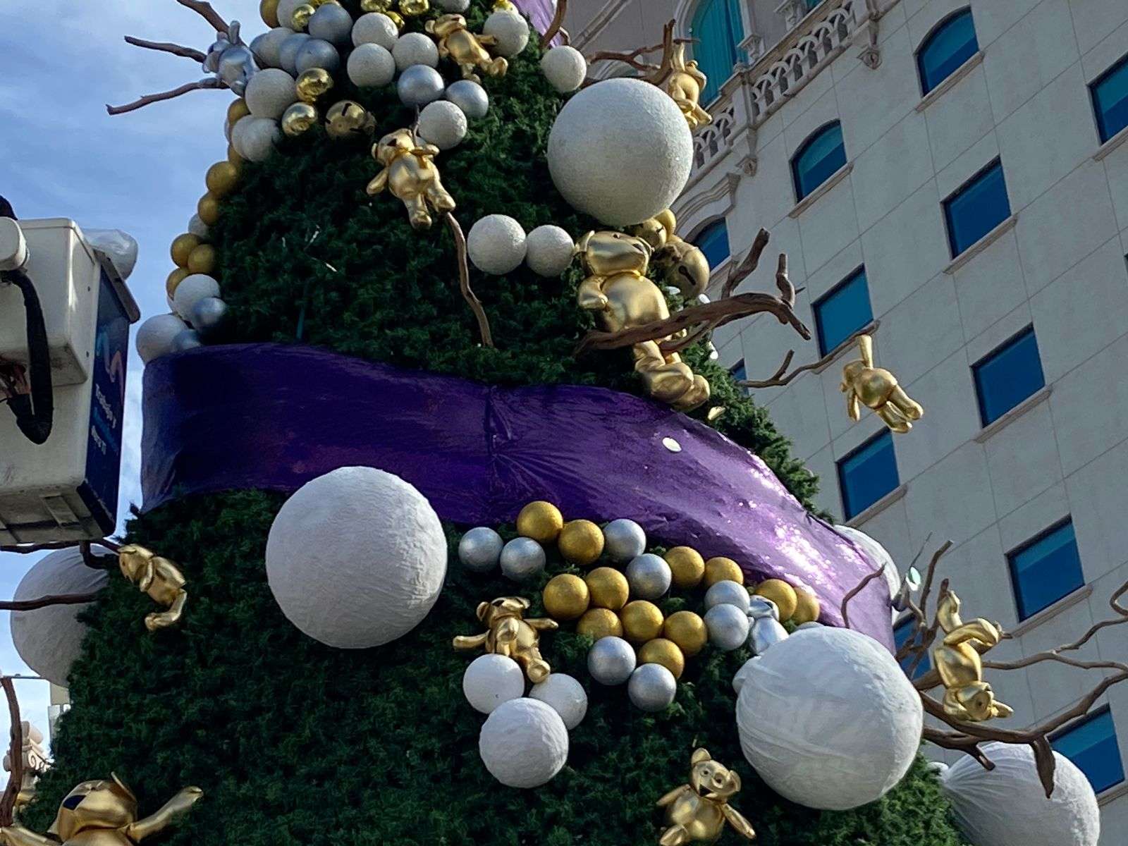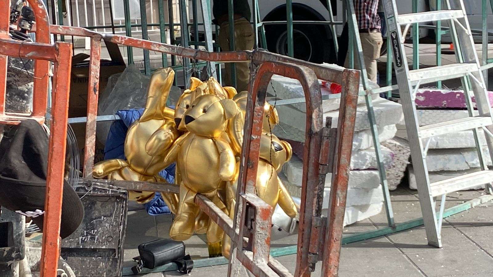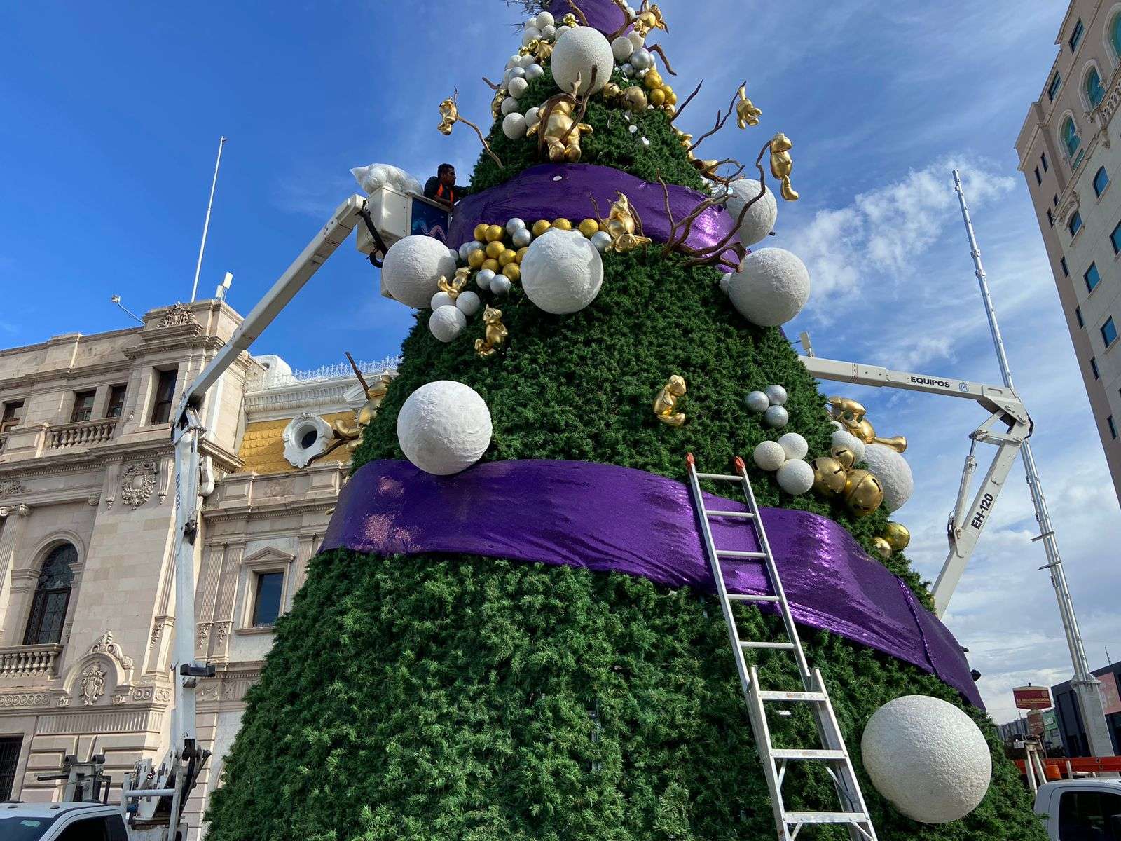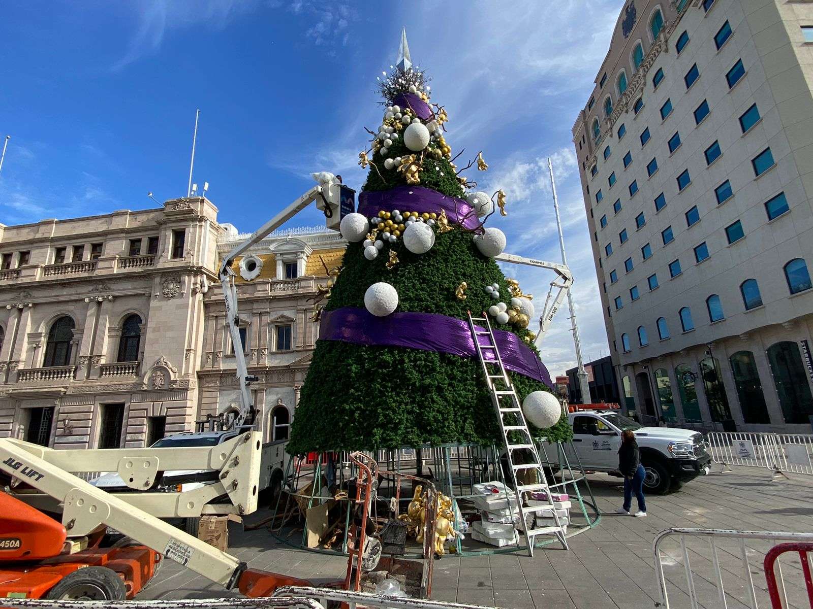 Chihuahua. - Trabajadores siguen con los preparativos para la instalación del Árbol de Navidad en la Plaza de Armas, que este año presenta una serie de decoraciones llamativas. Entre ellas destacan osos de peluche en tonos dorados y troncos secos de los que cuelgan más peluches.