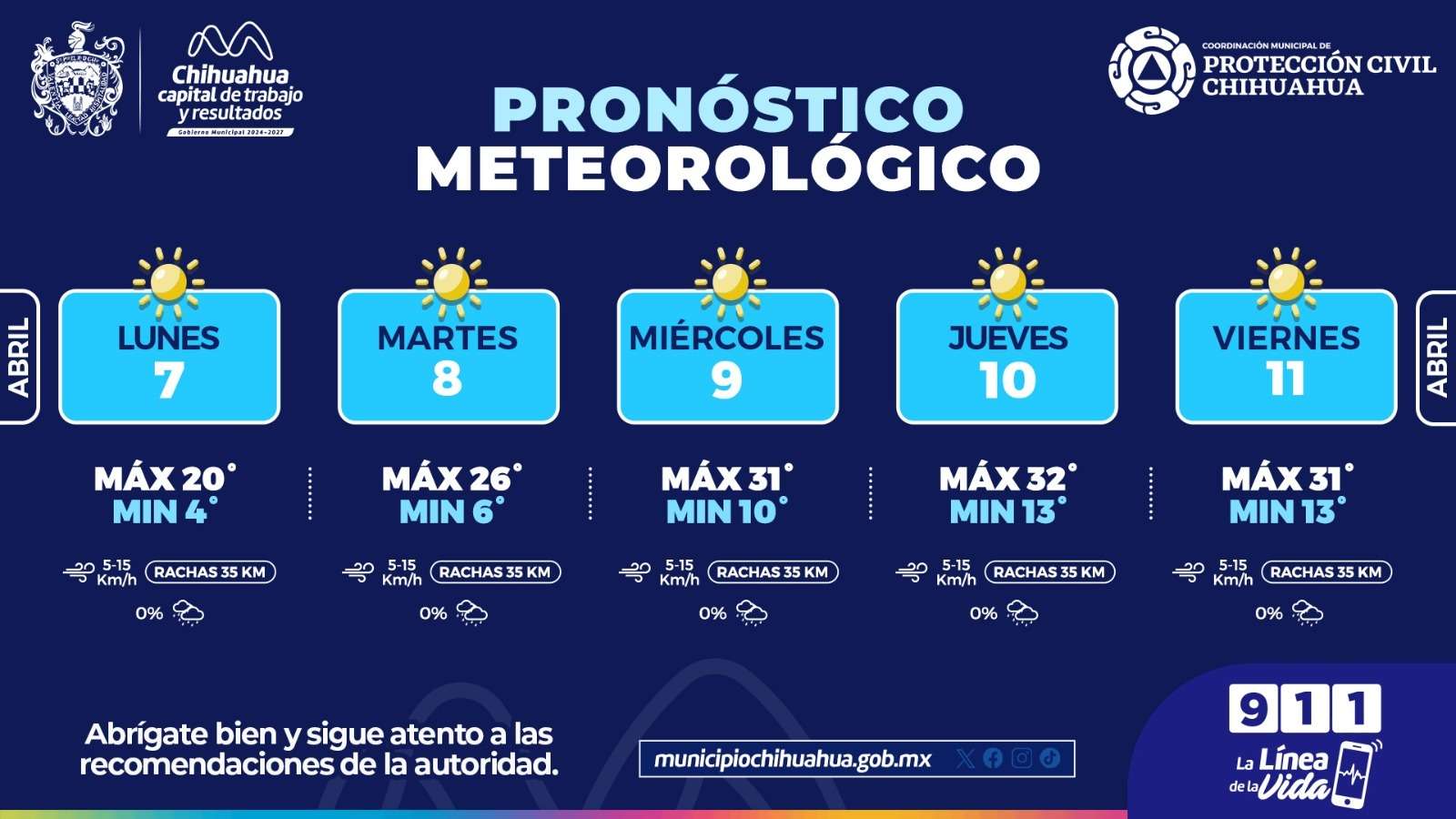 Chihuahua.- La Coordinación de Protección Civil Municipal informa que para esta semana se pronostican temperaturas máximas de 32°C con mínimas de 6°C, por lo que se exhorta a la población a no confiarse al salir de casa por los cambios de temperaturas.