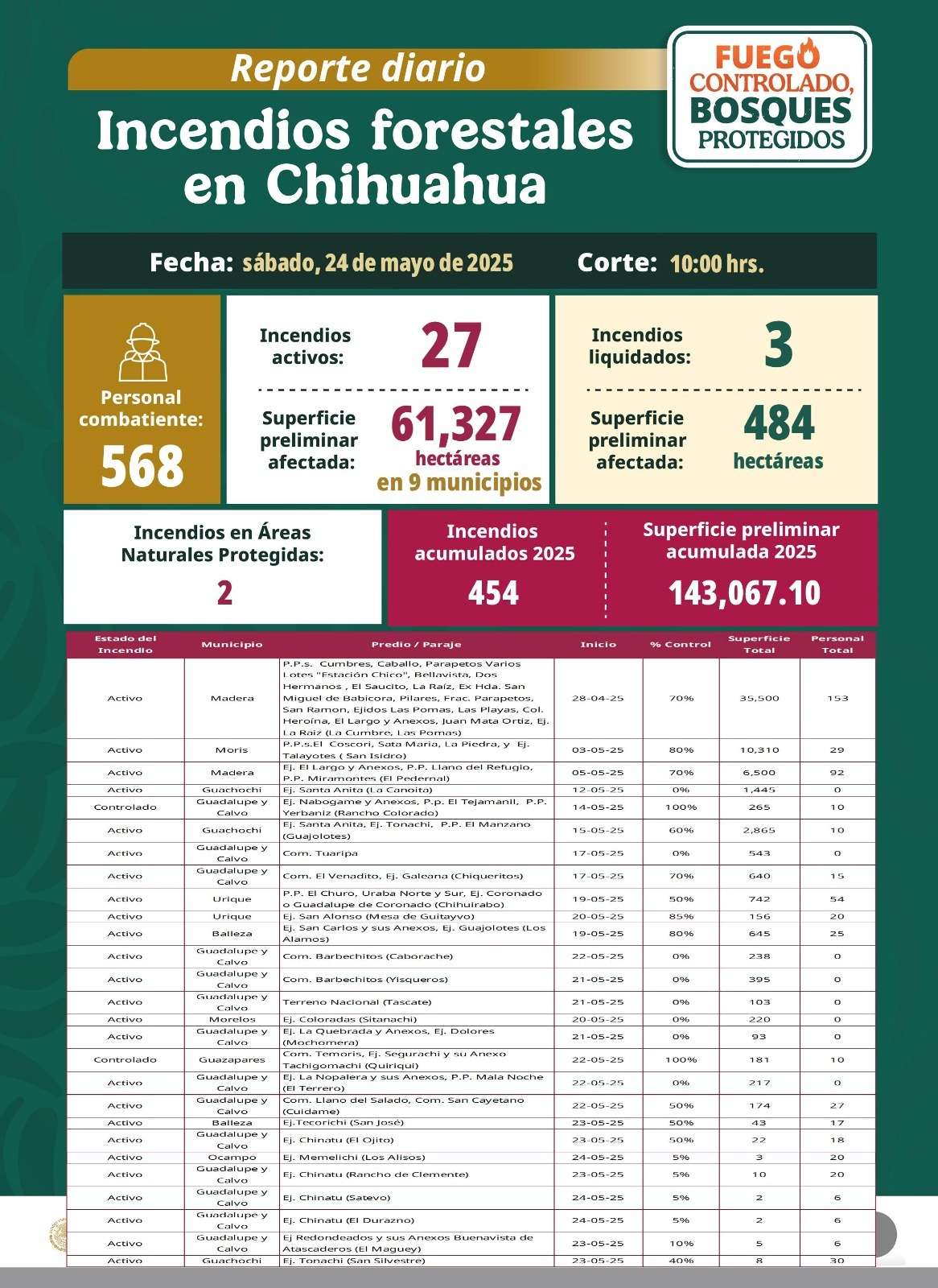 Según el reporte oficial 568 combatientes realizan los trabajos para sofocar los incendios que con corte hasta las 10:00 horas de este sábado 24 de mayo, se registra una superficie de 61 mil 327 hectáreas afectadas, dos de ellas correspondientes a áreas protegidas.