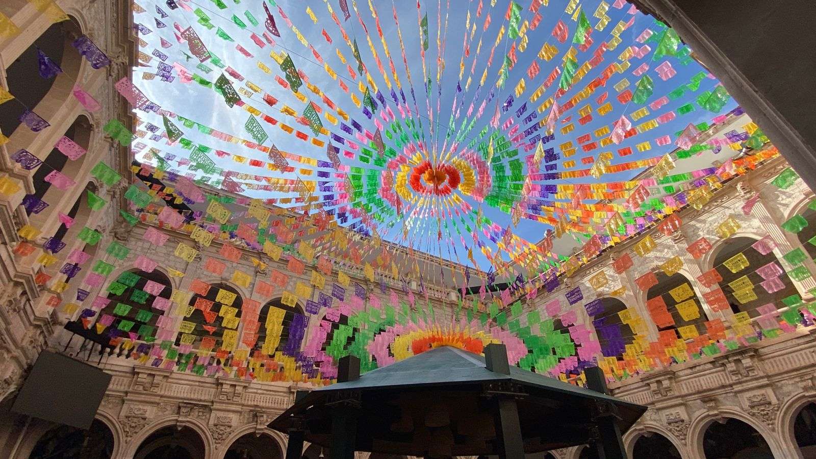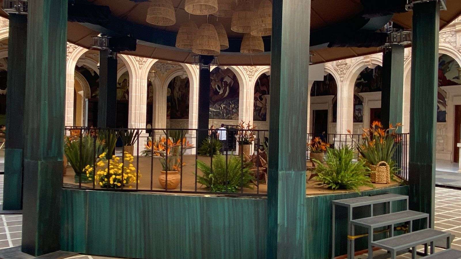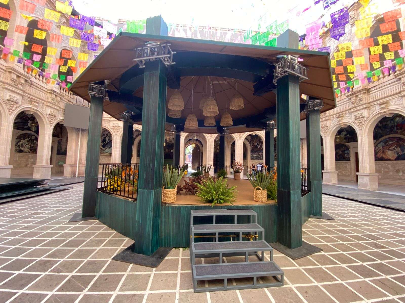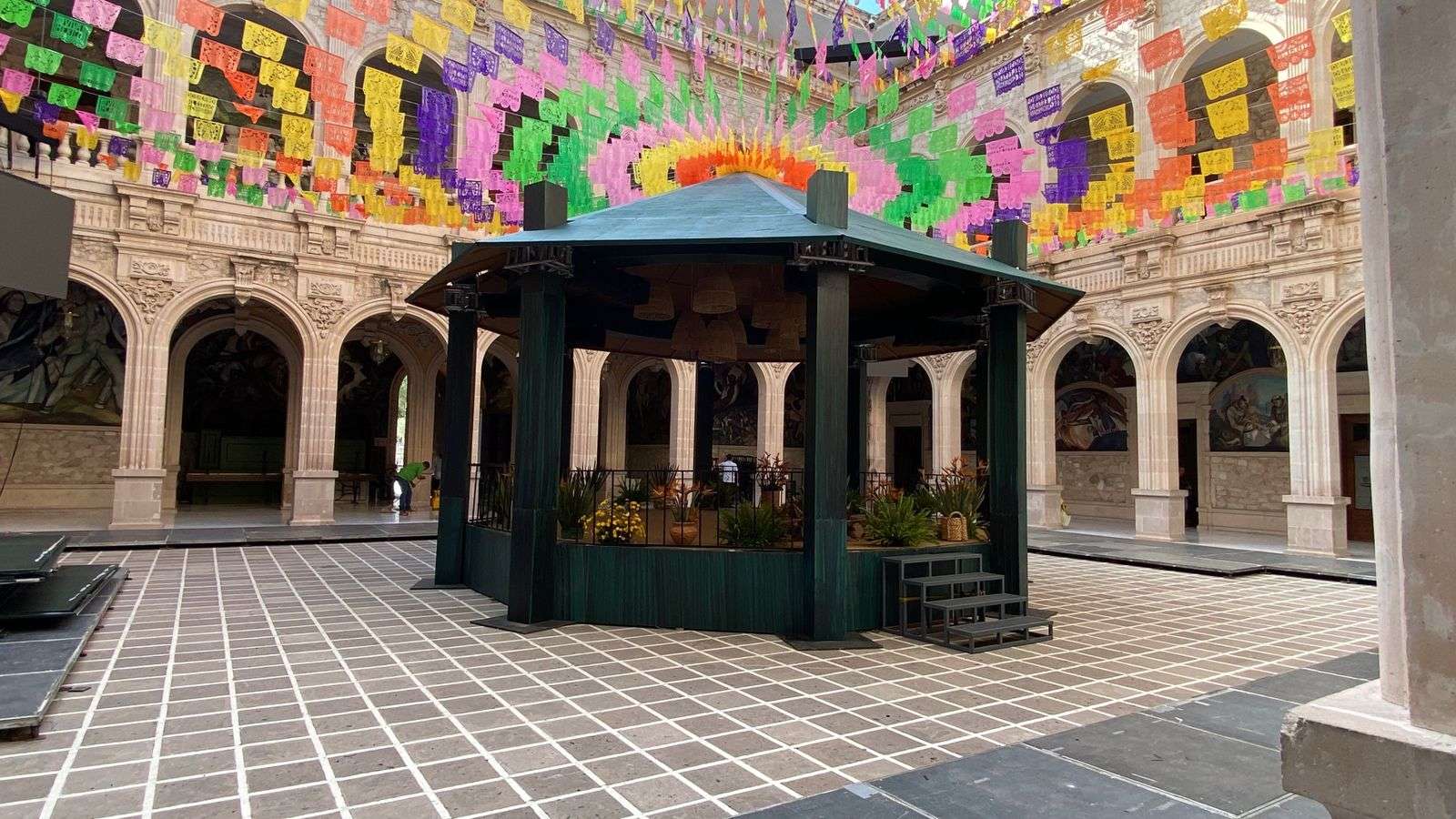 Chihuahua.- En el patio central de Palacio de Gobierno aún permanecen los arreglos que decoraron las fiestas patrias por el Grito de Independencia, incluyendo un kiosco de madera, pantallas y adornos multicolores en el techo.