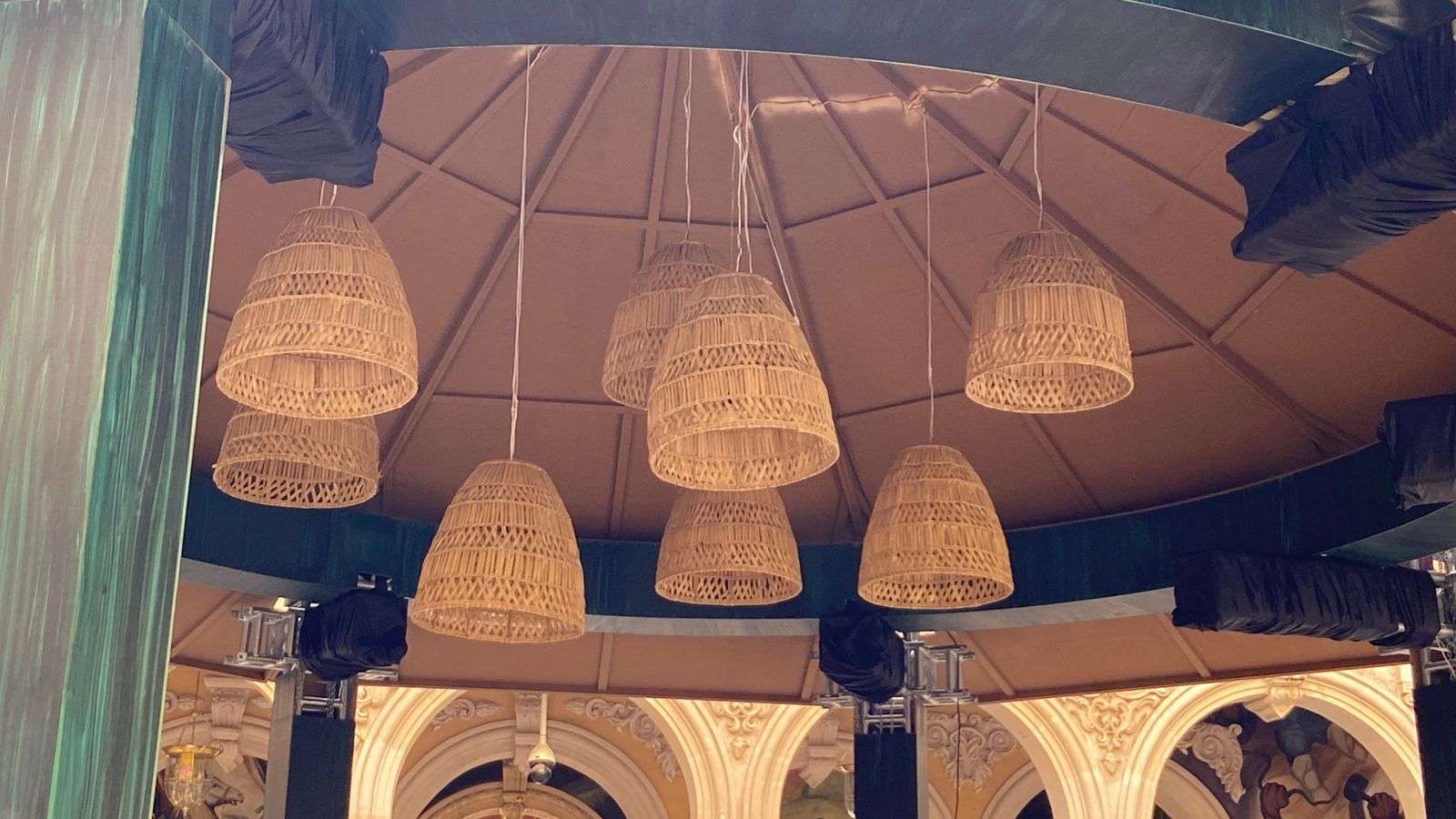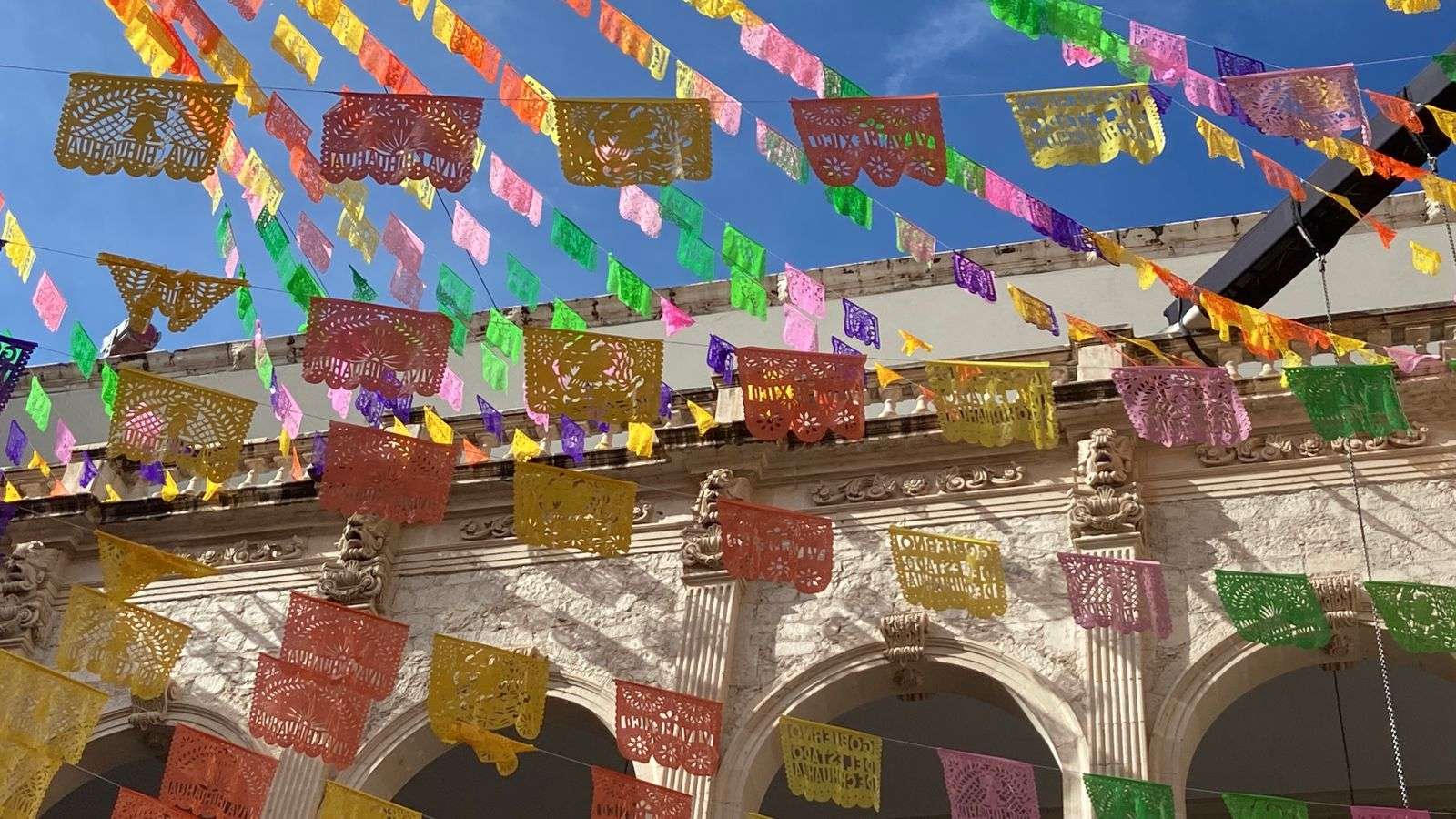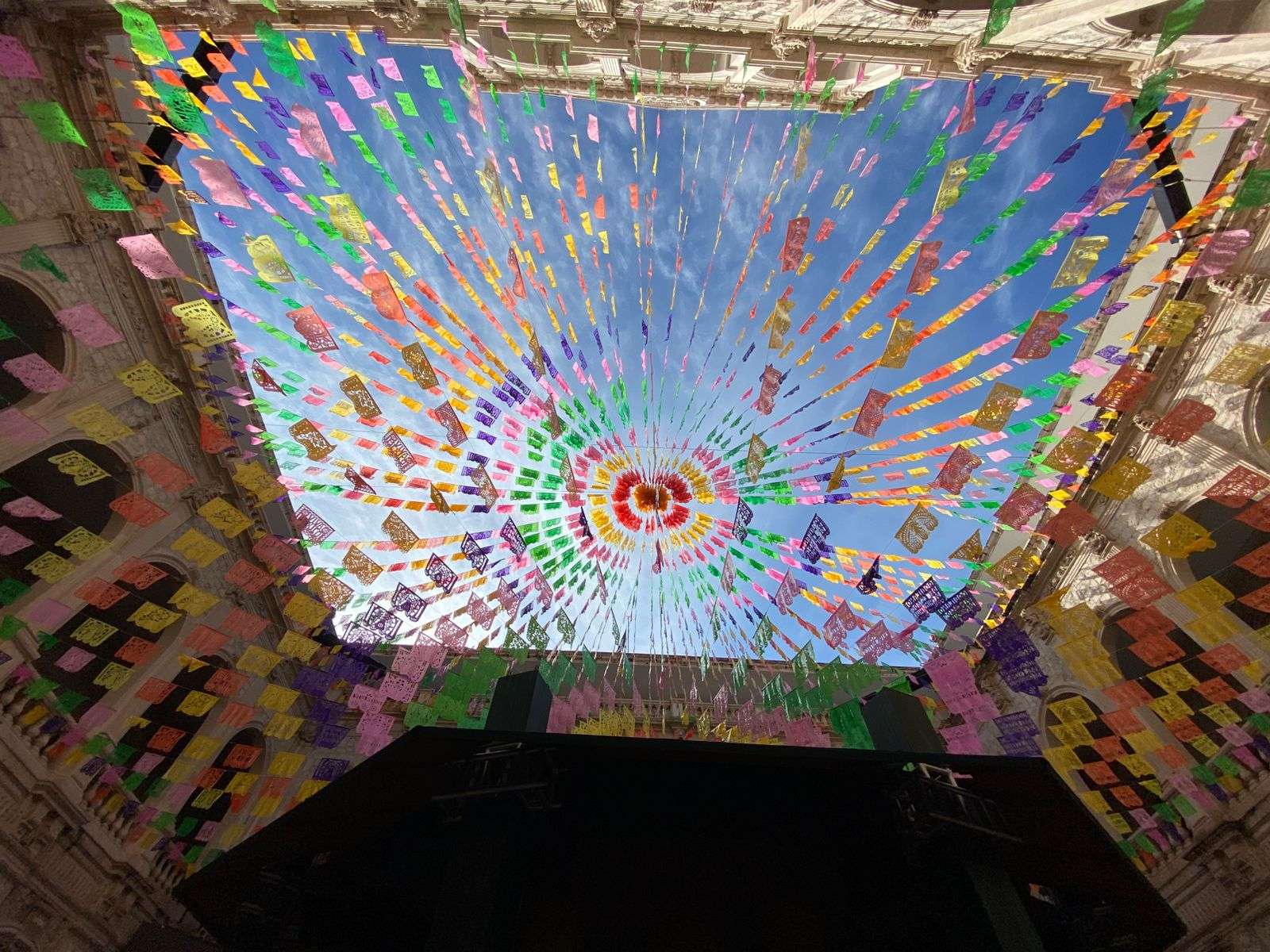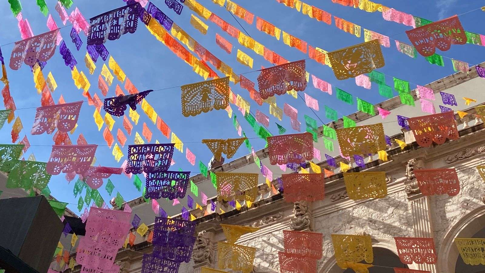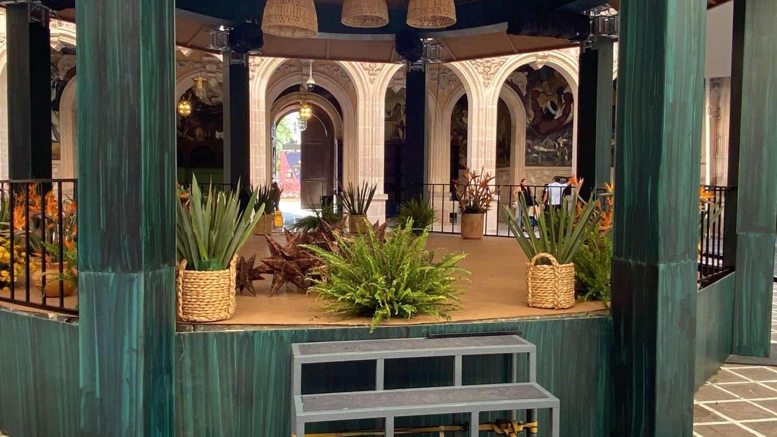 Chihuahua.- En el patio central de Palacio de Gobierno aún permanecen los arreglos que decoraron las fiestas patrias por el Grito de Independencia, incluyendo un kiosco de madera, pantallas y adornos multicolores en el techo.