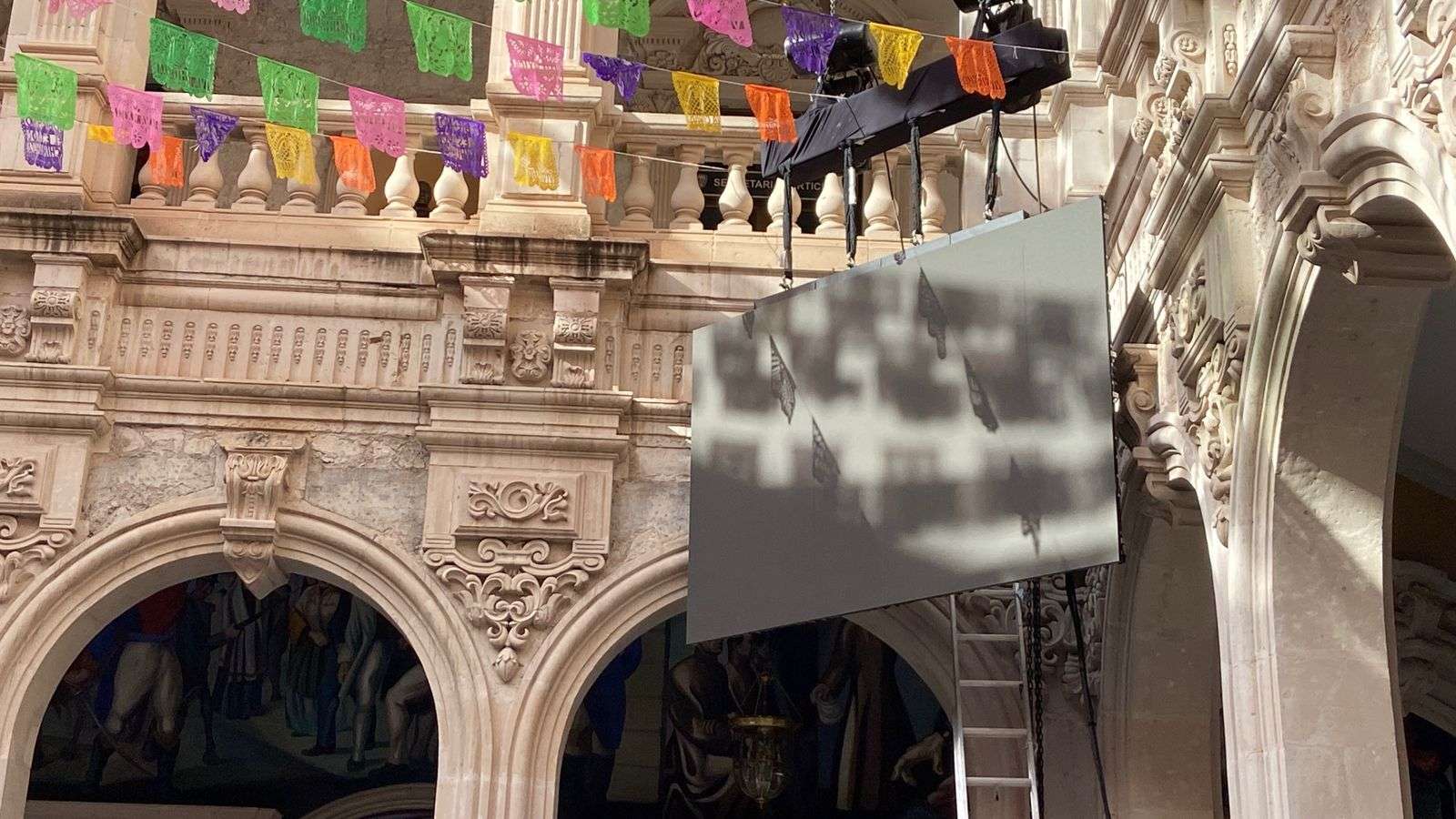 Además, ya comenzaron a retirar las pantallas que se encontraban en las cuatro esquinas del patio y que fueron utilizadas para proyectar el acto protocolario del Grito de Independencia.