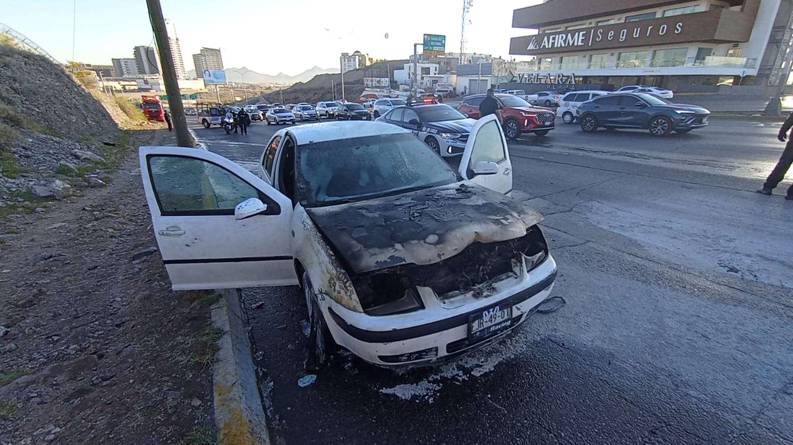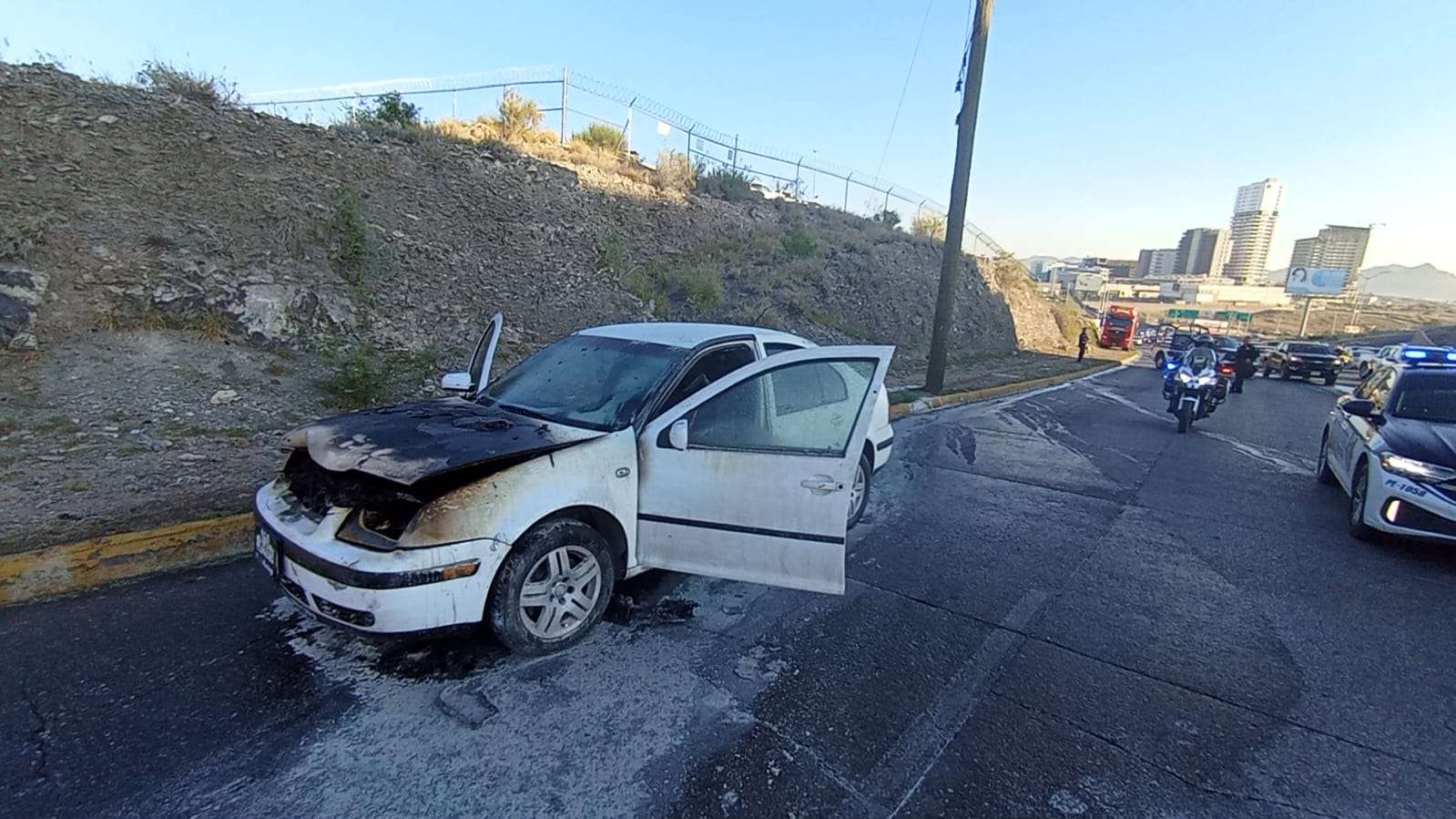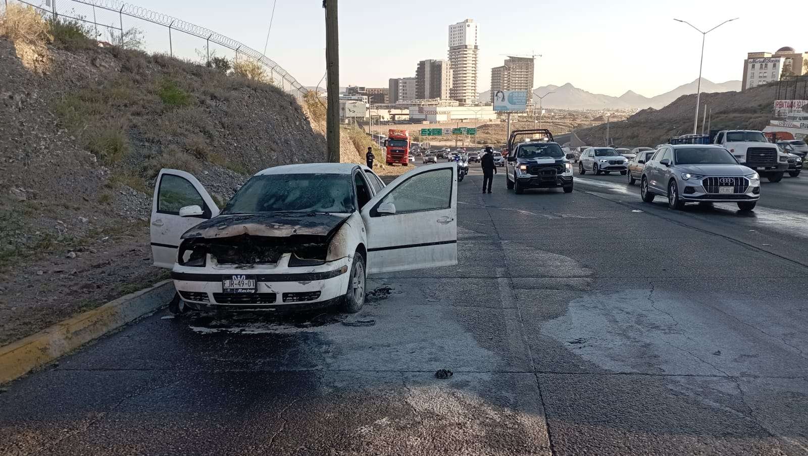 Chihuahua.- Esta mañana un vehículo Volkswagen Jetta comenzó a encenderse por la parte del motor cuando el conductor circulaba sobre el periférico y la juventud en sentido del norte sur justo pasando la Vía Sicilia.