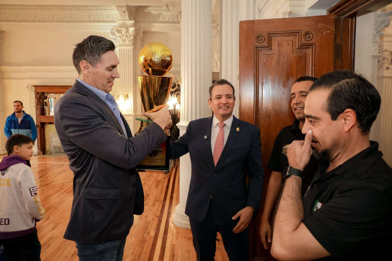 Chihuahua.- El alcalde Marco Bonilla recibió en la Presidencia Municipal a niños y jóvenes deportistas de diferentes equipos representativos de la ciudad, a quienes se les sorprendió con la visita de Eduardo Nájera, chihuahuense ex jugador profesional en la NBA.