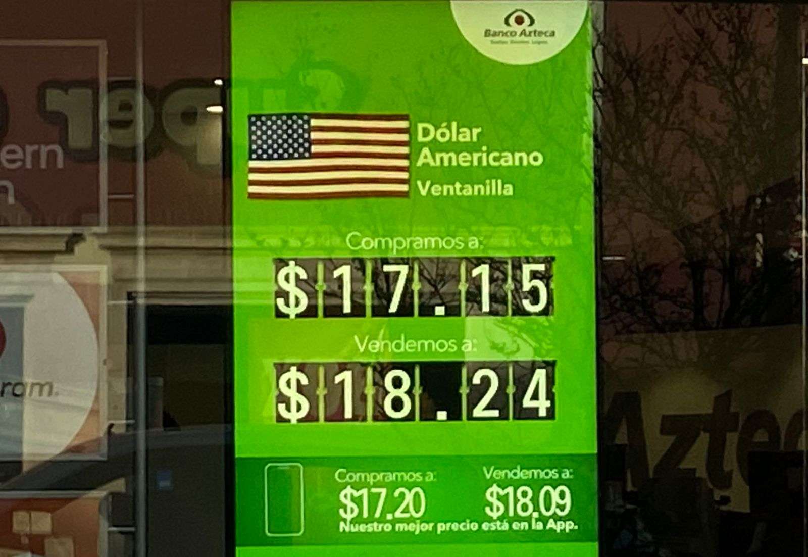 Chihuahua.- El dólar americano para este jueves 12 de marzo en las ventanillas de Banco Azteca, ubicadas en la calle Cuarta y Aldama, se ofreció en $18.24 a la venta y en $17.15 a la compra.