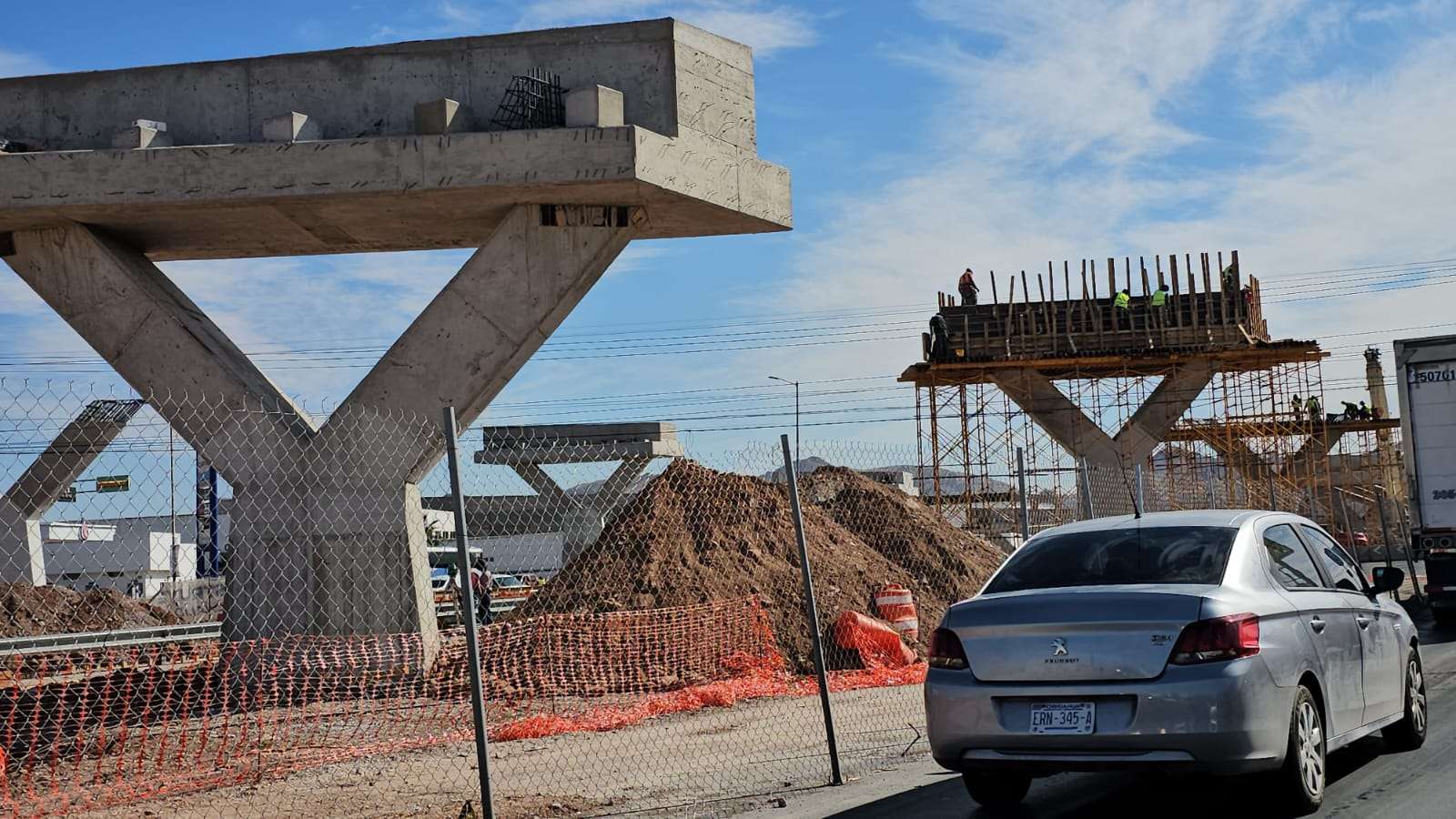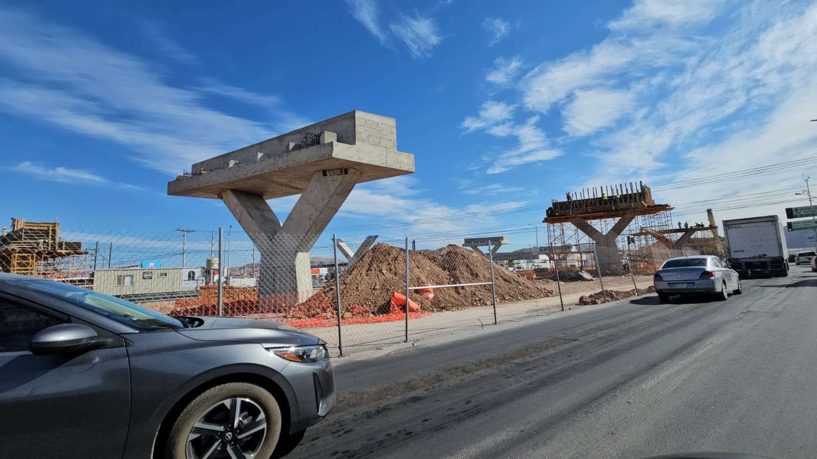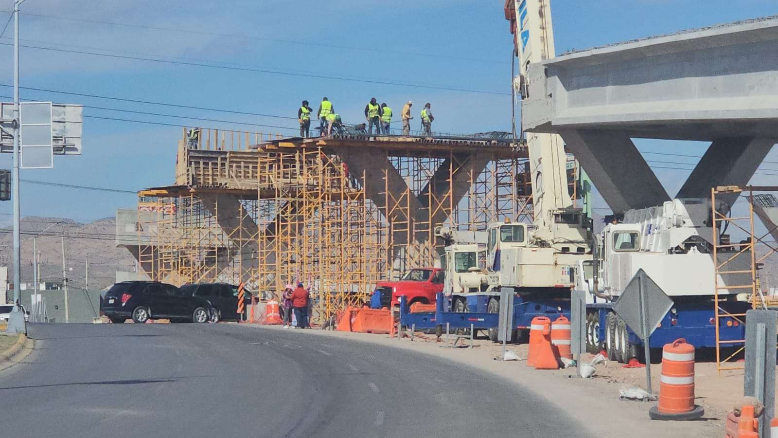 Chihuahua.– La construcción del puente superior en la Vialidad Los Nogales registra un avance significativo con la edificación de los pilares que sostendrán la parte más alta de la estructura.