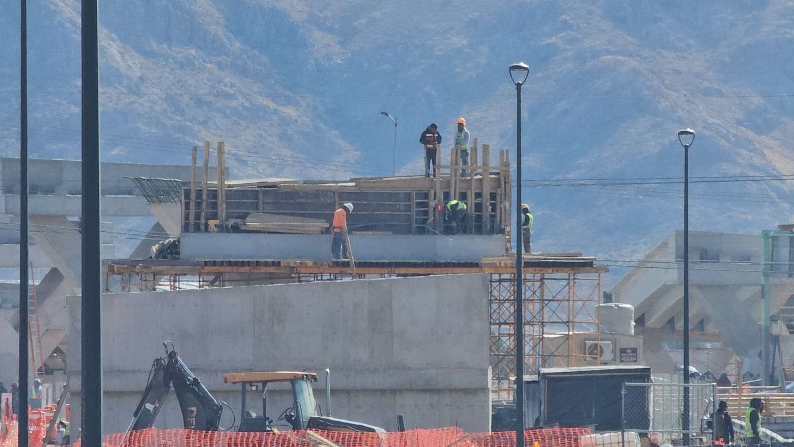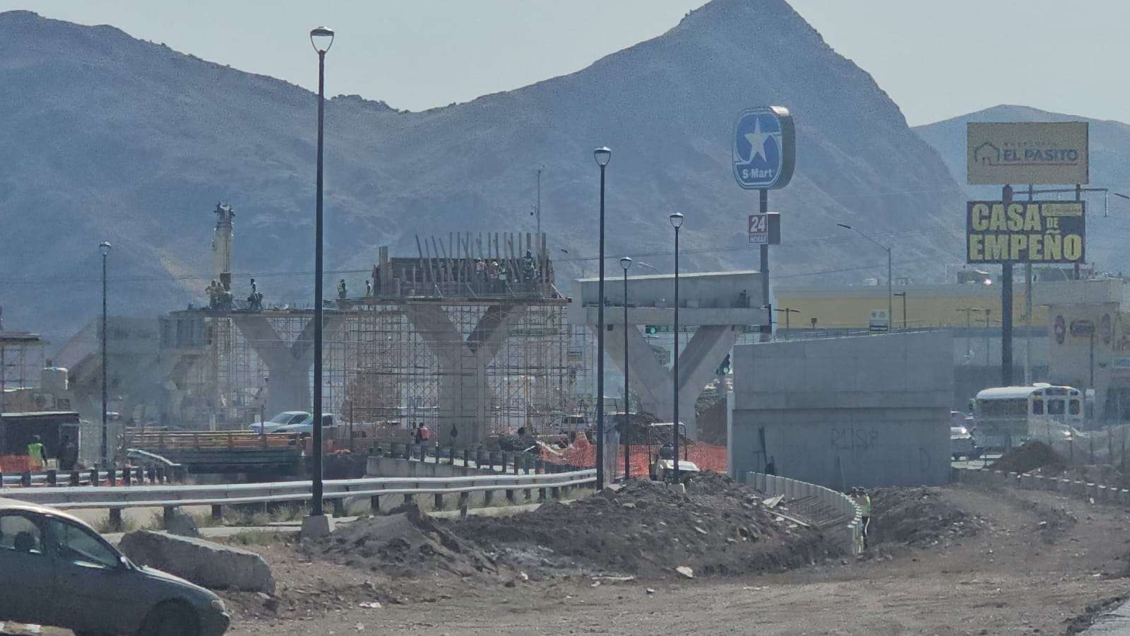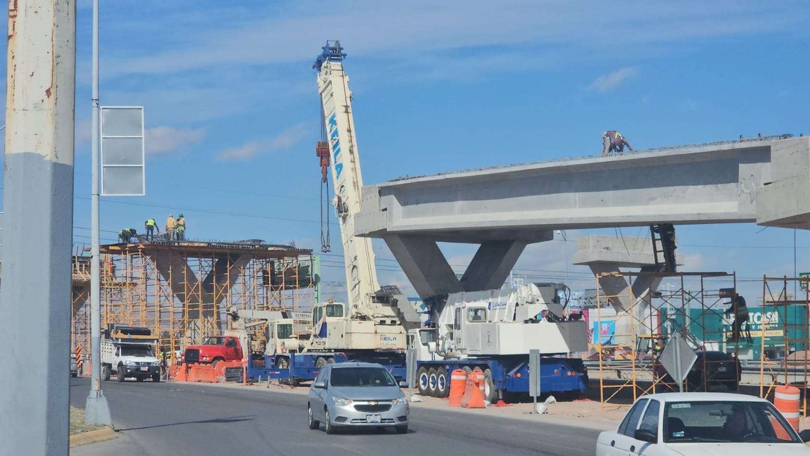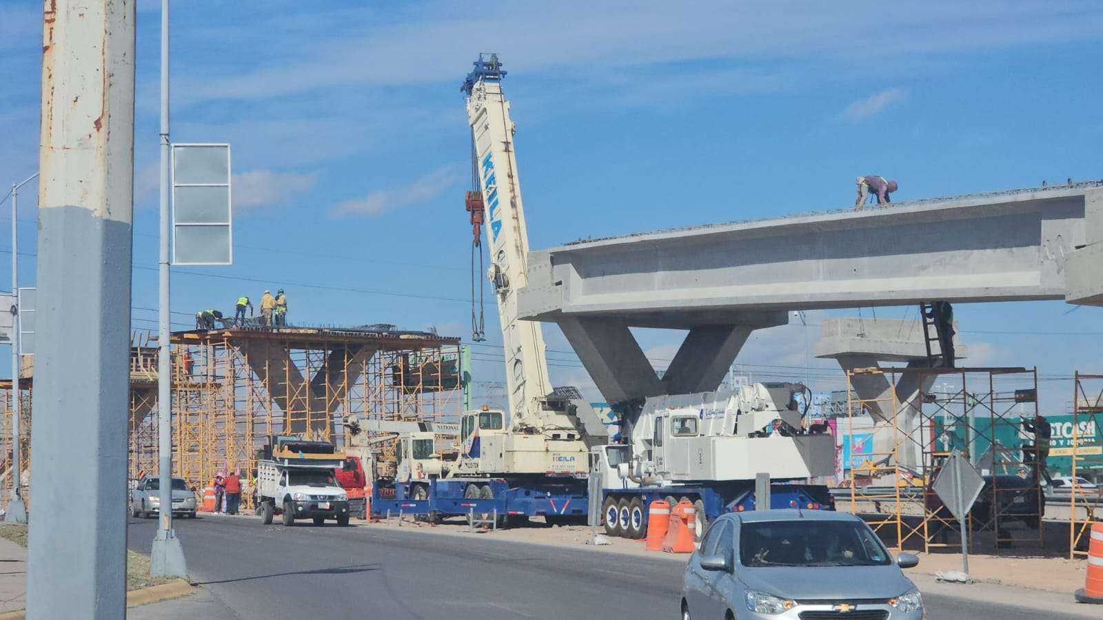 Chihuahua.– La construcción del puente superior en la Vialidad Los Nogales registra un avance significativo con la edificación de los pilares que sostendrán la parte más alta de la estructura.