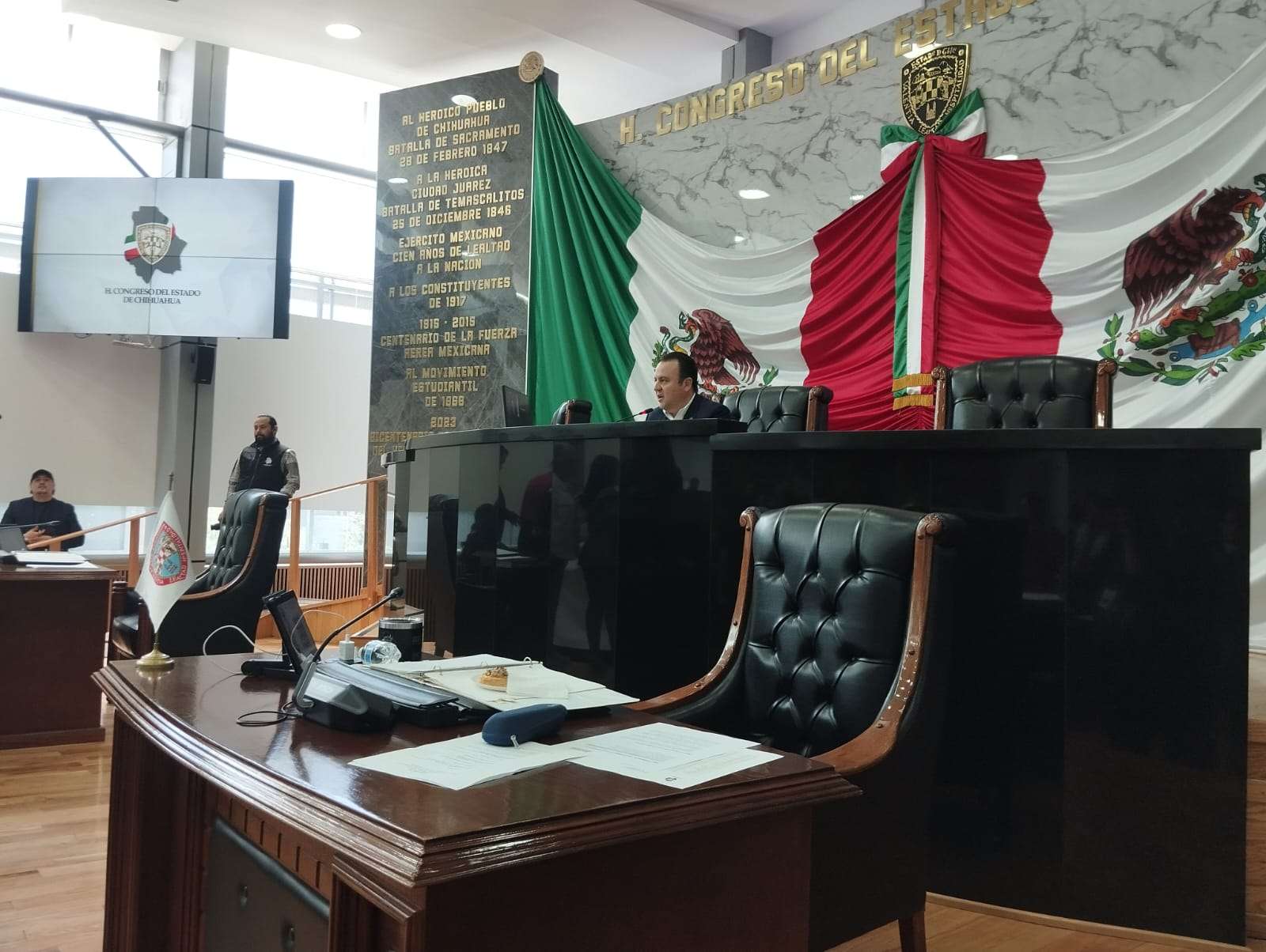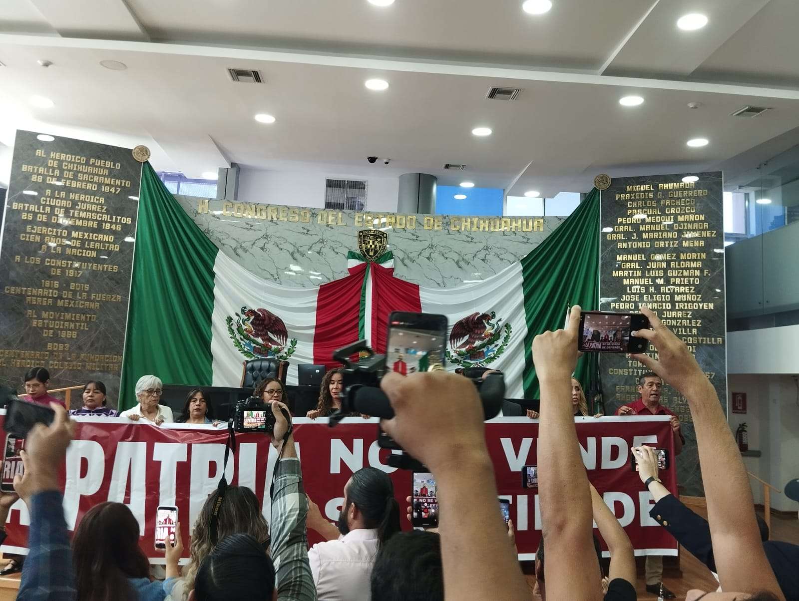 Chihuahua.– Durante la sesión del Congreso del Estado, la bancada de Morena se presentó en la tribuna con una pancarta con la leyenda: “La patria no se vende se defiende”, como posicionamiento político durante los trabajos legislativos de este jueves.