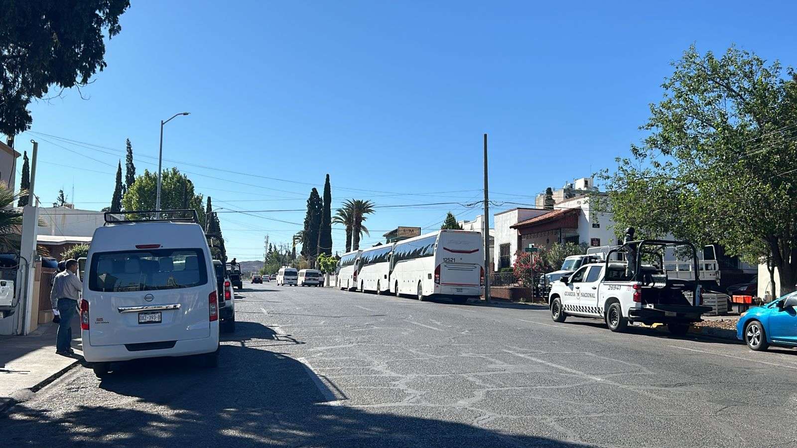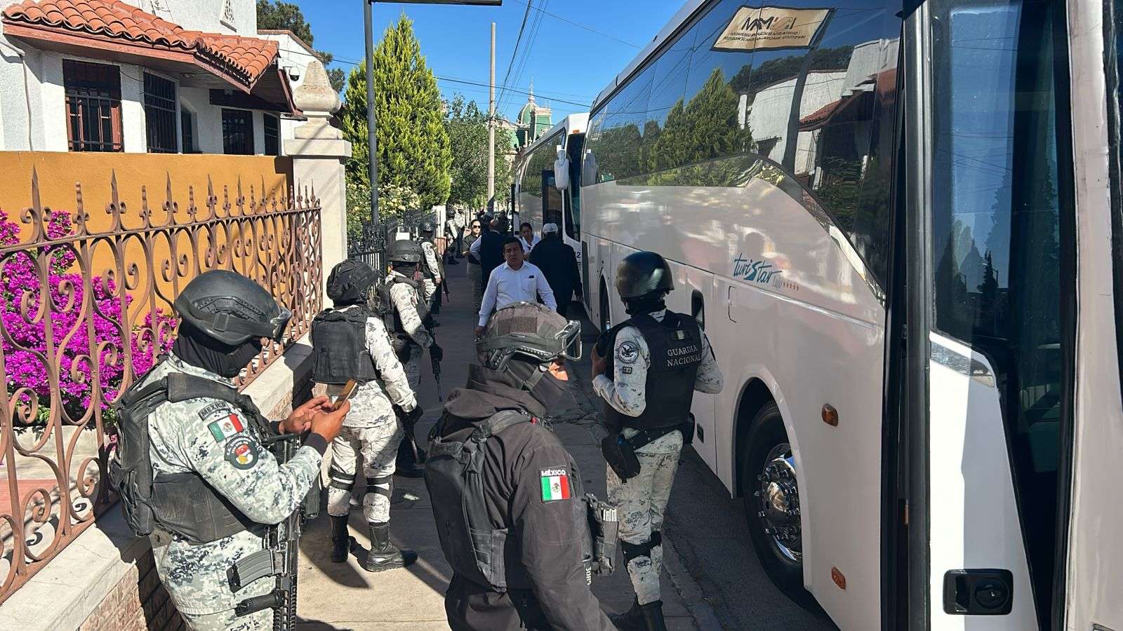 Chihuahua.- Varios camiones se colocaron frente a las oficinas del Instituto de Migración de la ciudad de Chihuahua resguardados por varios elementos de la Guardia Nacional.