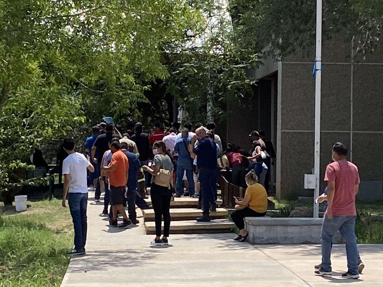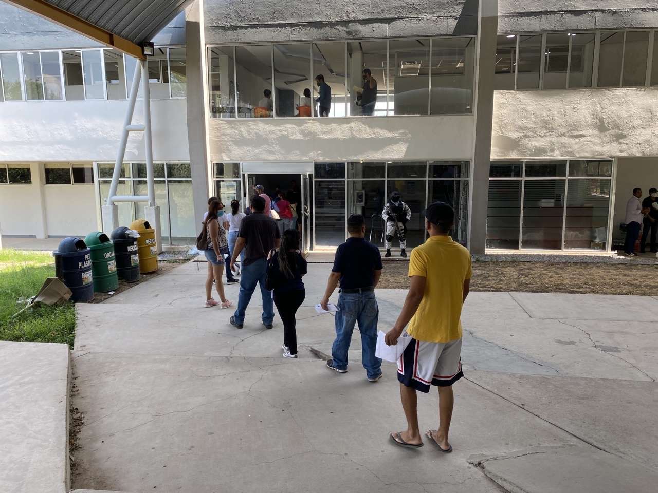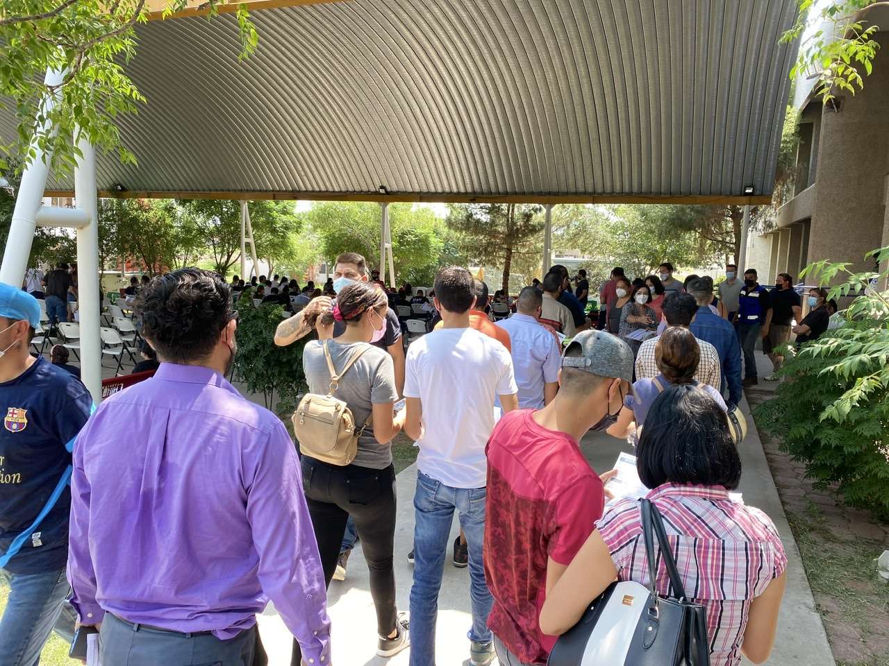 Chihuahua.- Población del rango de edad de entre 25 a 39 años, acudieron a las instalaciones es del Tecnológico Campus II a la aplicación de la primera dosis de la vacuna de AstraZeneca.