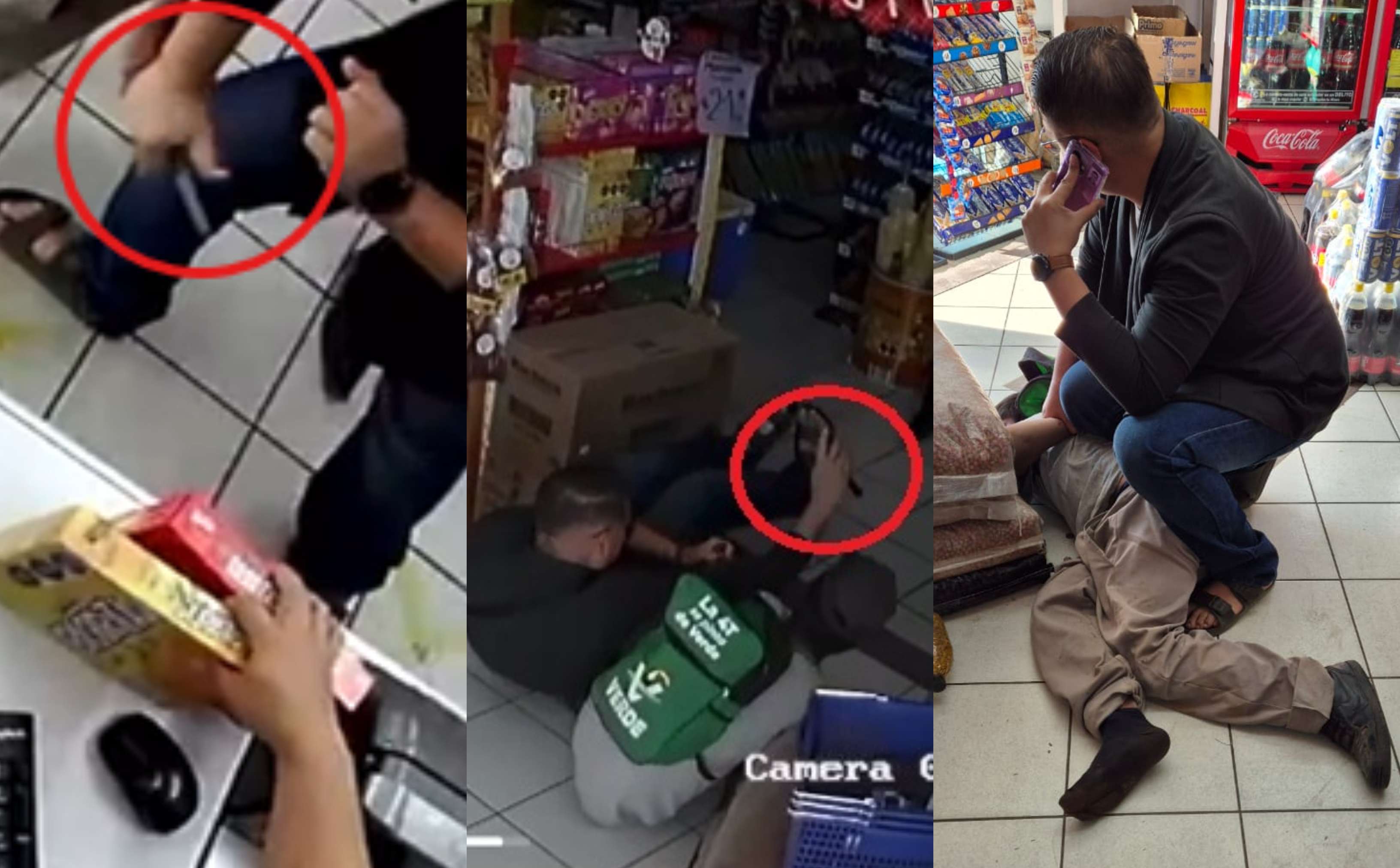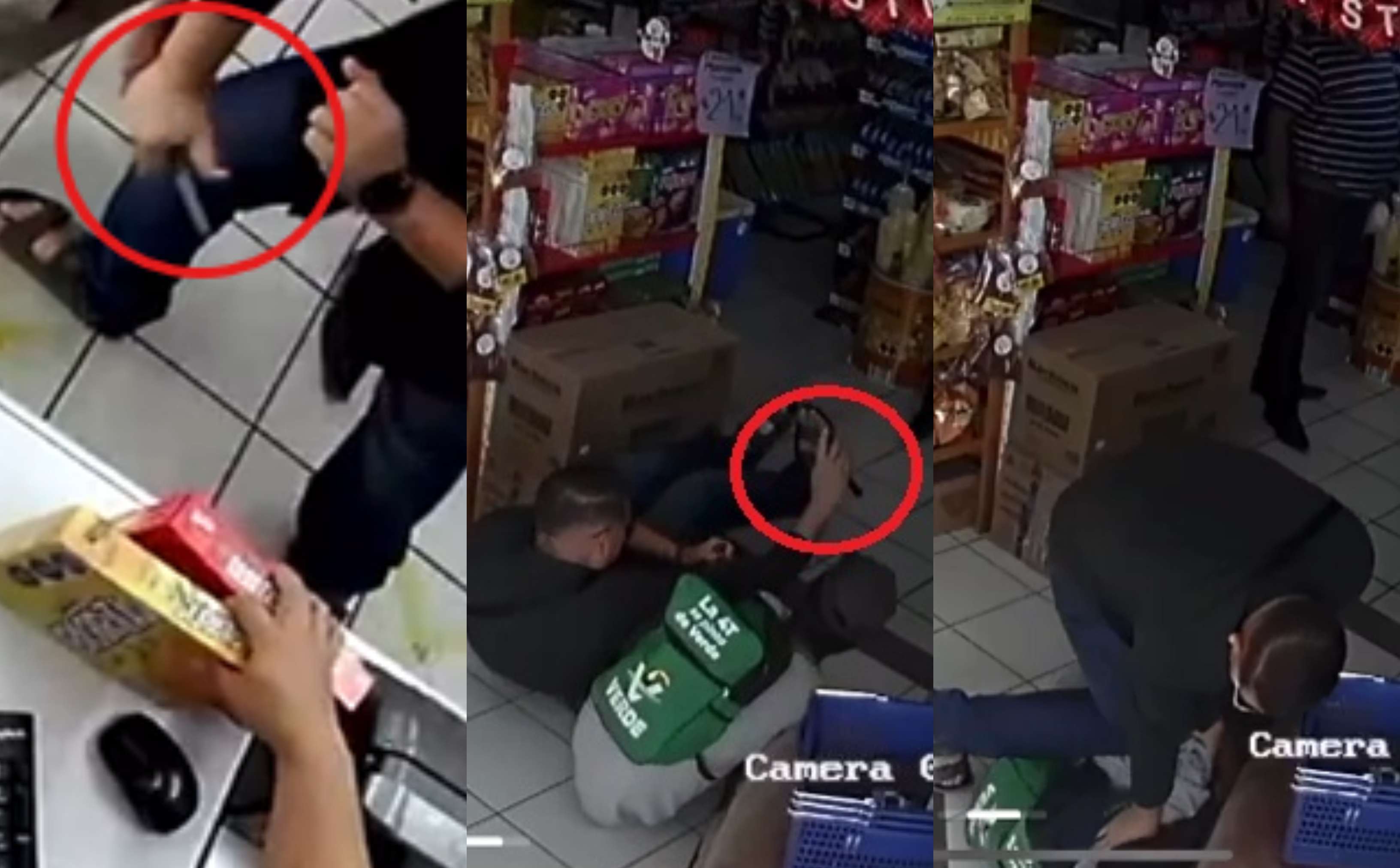 Luego ya en el piso de la tienda, el municipal logra someter al presunto asaltante.