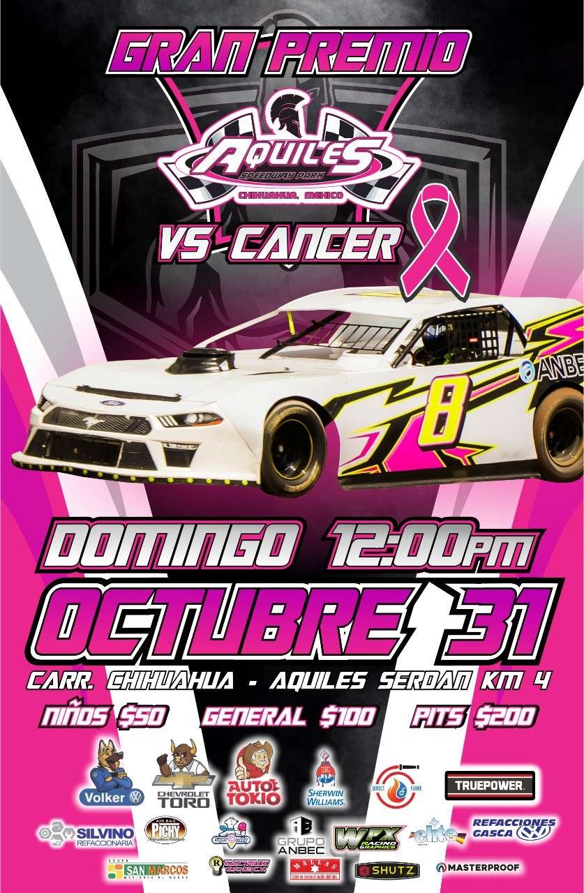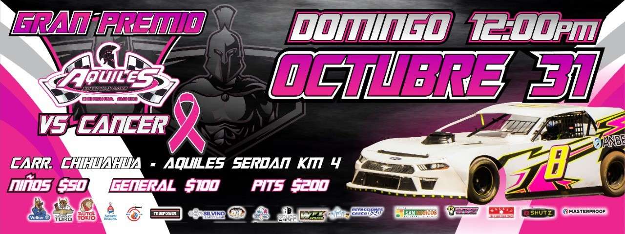 La invitación está hecha por parte de los promotores del evento, quienes convocan al público a que acuda este domingo 31 de octubre al Gran Premio Aquiles Speedway Park contra el cáncer de mama, para disfrutar de la emoción y la adrenalina en el óvalo de terracería más rápido de México. El evento está programado para iniciar a las 11:00 AM con las prácticas y rodado de pista y el inicio de las carreras a las 12:00 del mediodía. El costo de entrada en acceso general para adultos es de $100.00 y en pits $200.00, mientras que los niños pagan $50.00 en cualquier localidad.