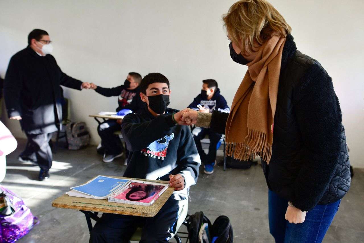 Chihuahua.- La Gobernadora del Estado visitó esta mañana la Escuela Secundaria Técnica No. 50 (EST 50), donde dialogó con directivos, personal docente y alumnos del plantel, en lo que fue el regreso a las clases presenciales, de acuerdo a lo dictaminado por el Consejo Estatal de Salud.