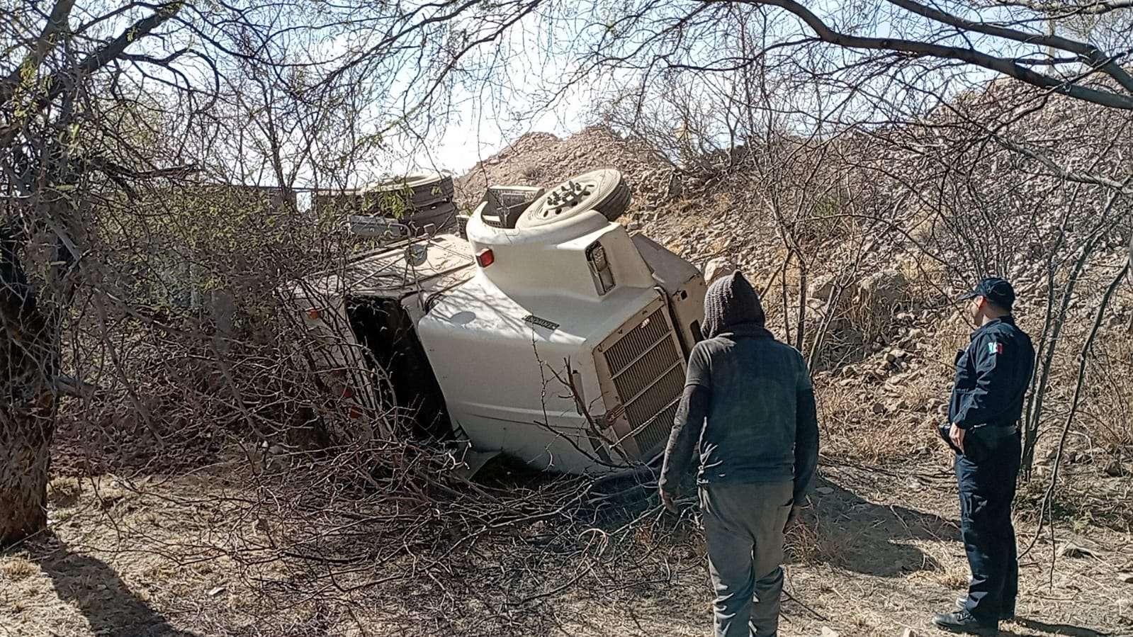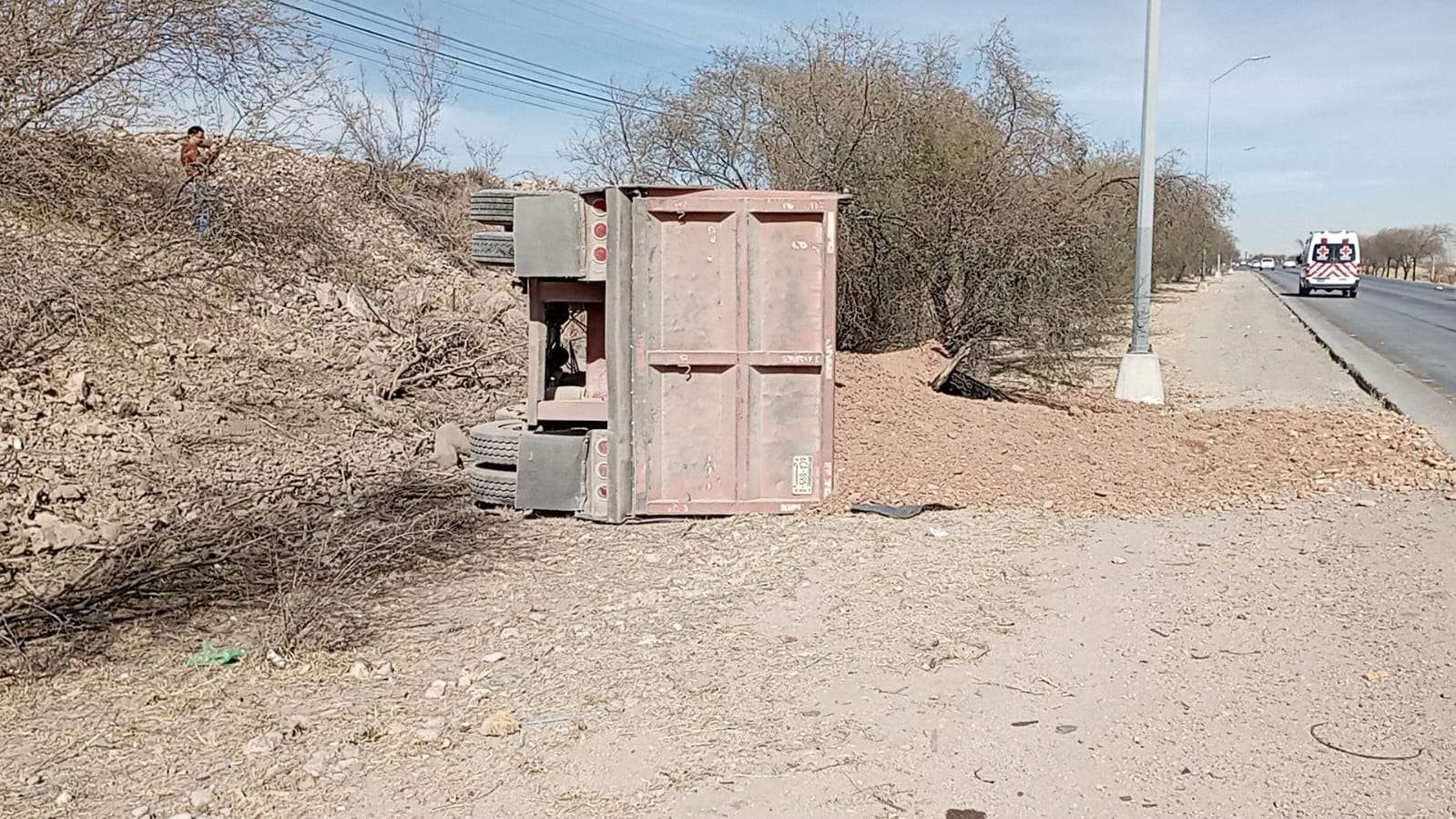 Chihuahua.- El conductor de un camión de volteo cargado con material para la construcción perdió el control y volcó sobre su costado derecho a la altura del kilómetro 3 de la carretera que conduce de Chihuahua hacia Ciudad Aldama.