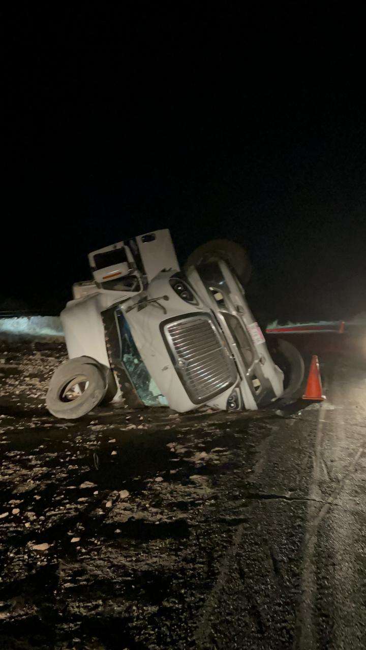Chihuahua.- Con daños totales resultó un camión de transporte al volcar en las curvas del perico.