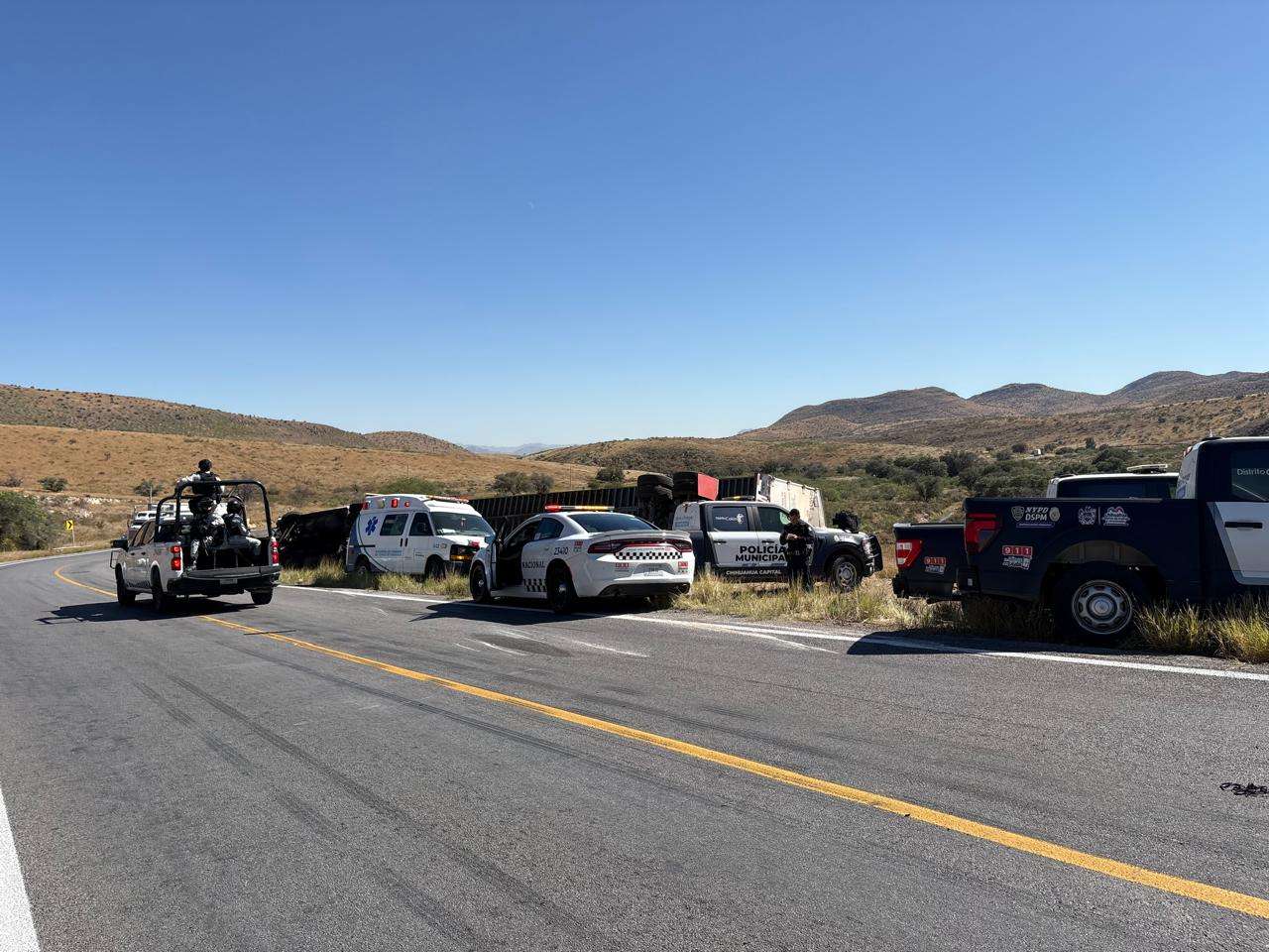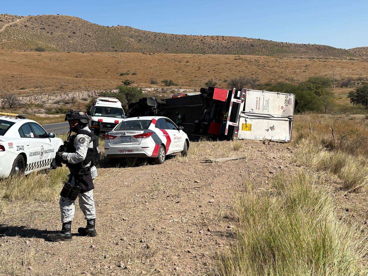Como primeros respondientes, agentes de la Policía Municipal acudieron al sitio del accidente para asegurar el área y desviar el tráfico, posteriormente, unidades de la Guardia Nacional (GN) tomaron conocimiento del accidente y se encargaron de elaborar el reporte correspondiente para deslindar responsabilidades y coordinar las maniobras de remolque del vehículo y la limpieza de la vía.