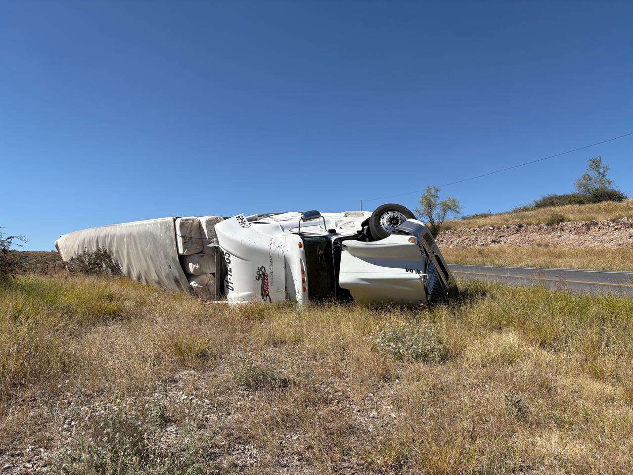 Chihuahua.- Un tráiler cargado con pacas de algodón sufrió una aparatosa volcadura en las llamadas curvas del Perico, específicamente a la altura del kilómetro 6.5 de la vía corta a ciudad Juárez.