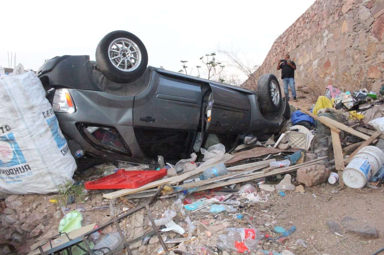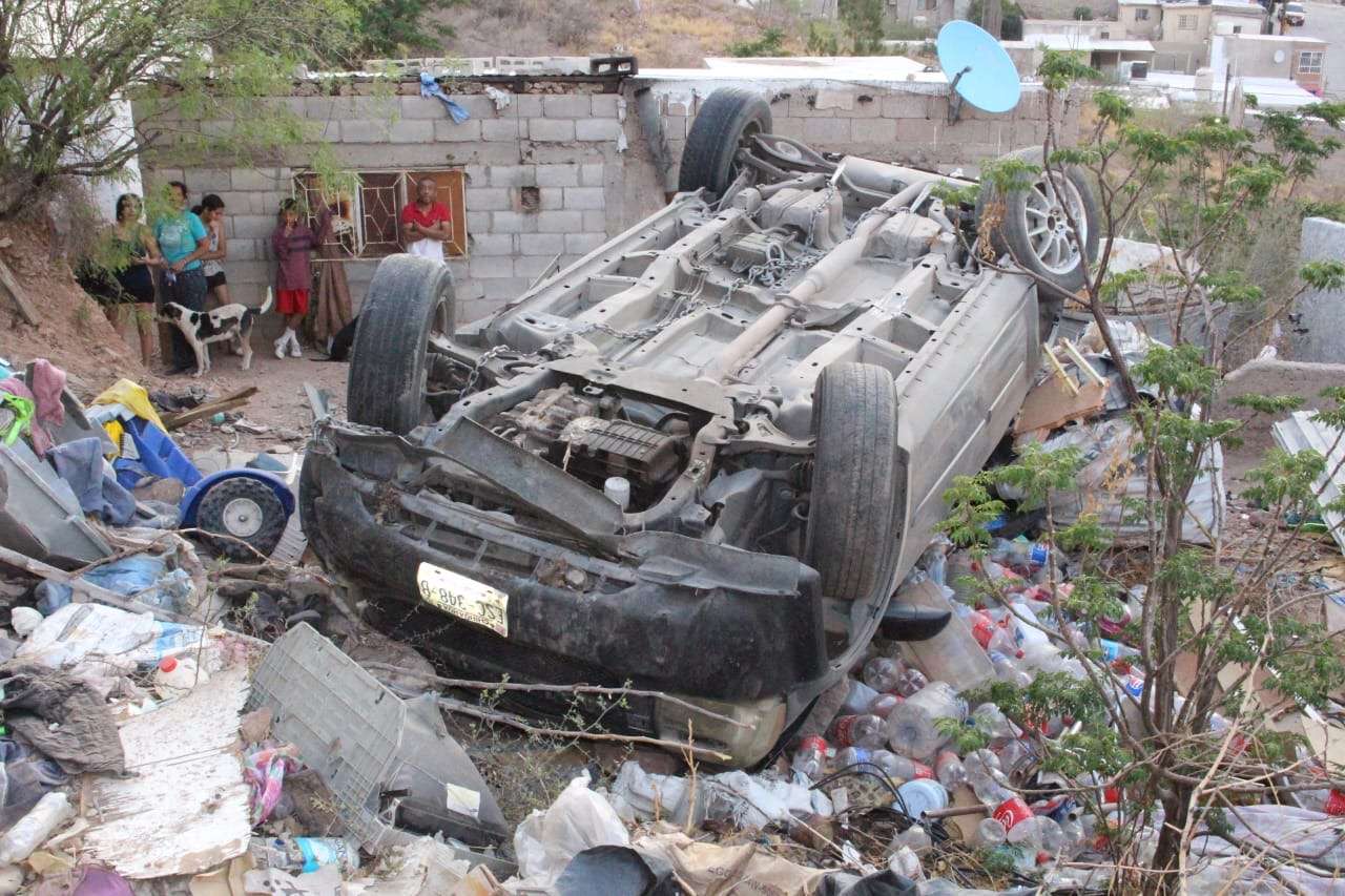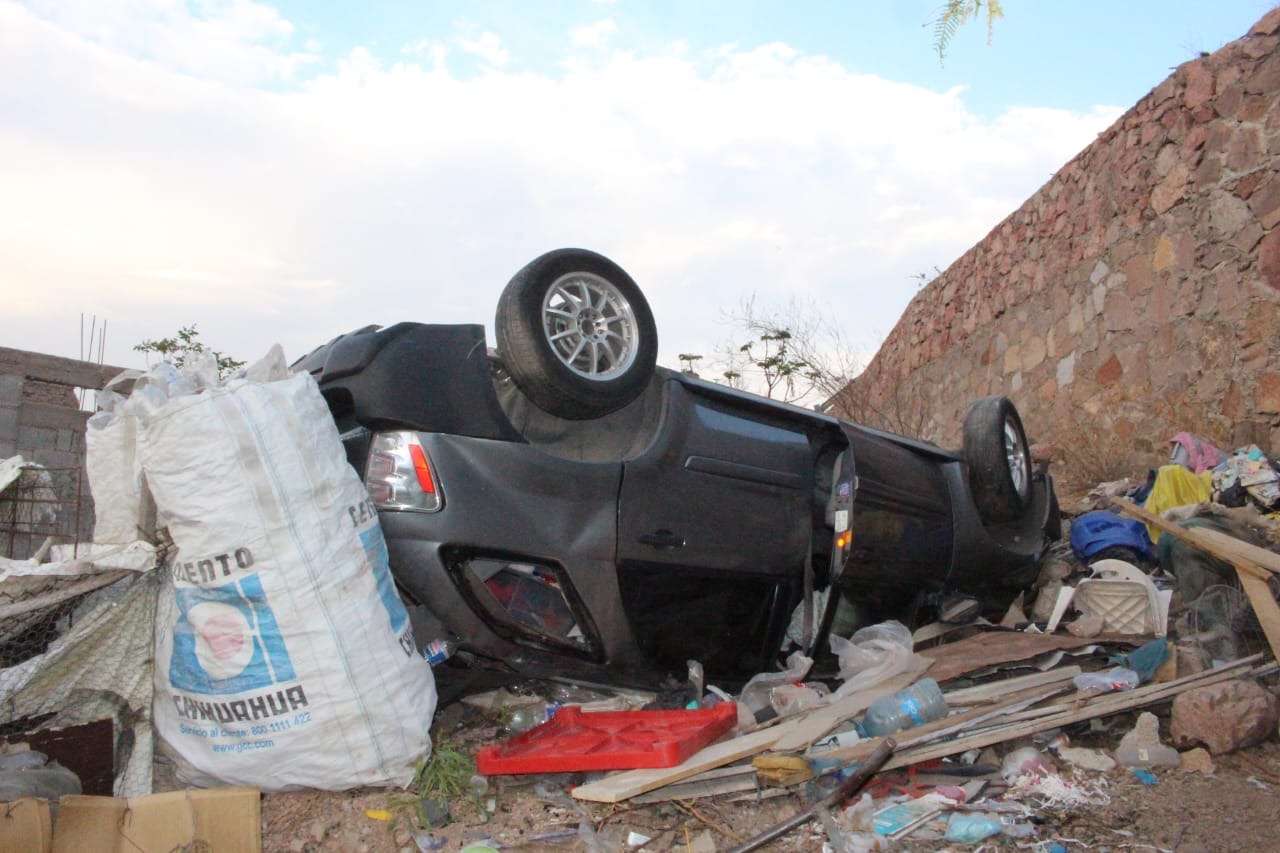 Chihuahua.- Una conductora perdió el control de su vehículo mientras circulaba sobre Prolongación 20 de Noviembre y calle 61, lo que provocó una aparatosa volcadura que terminó en el traspatio de una vivienda en la colonia Popular.