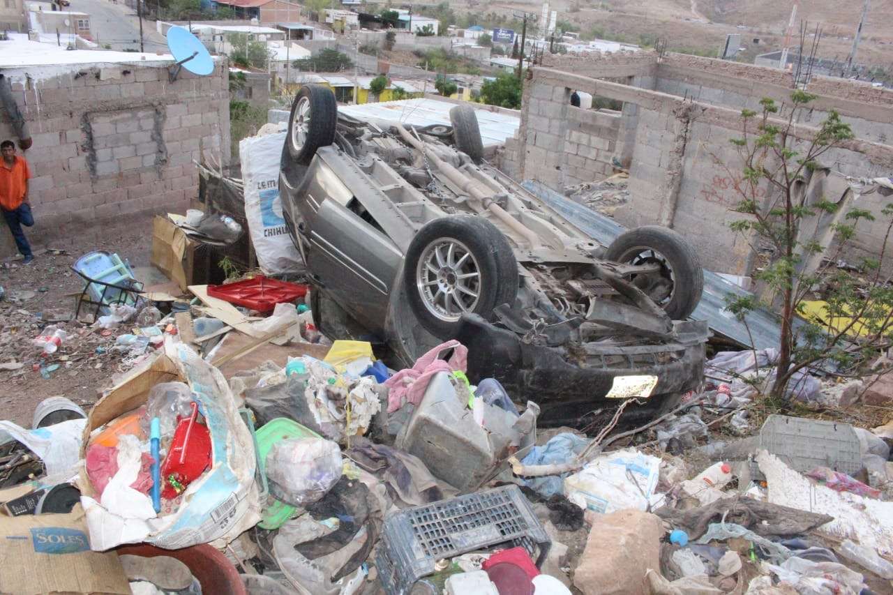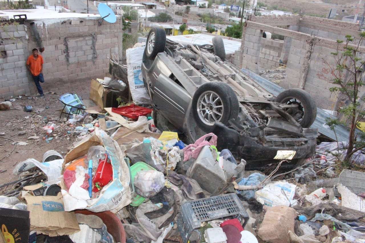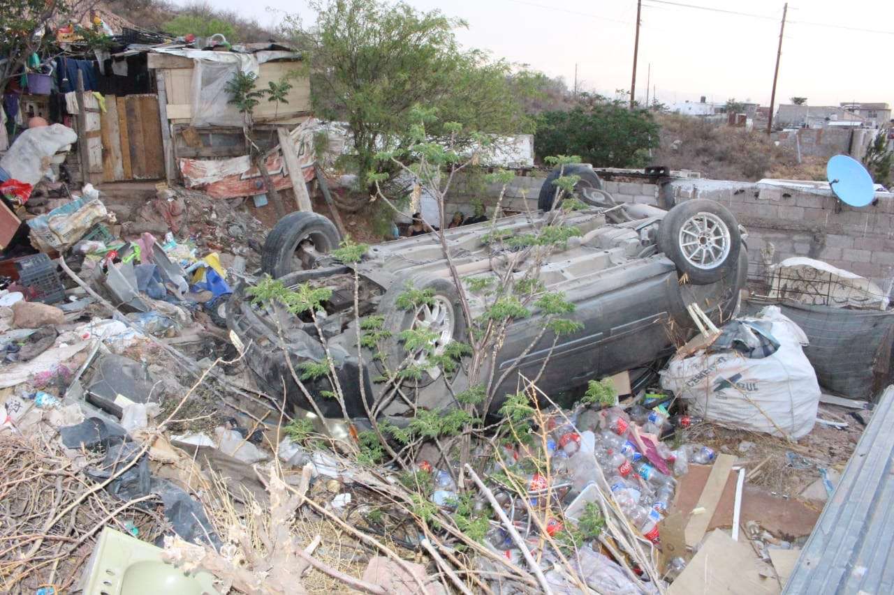 Chihuahua.- Una conductora perdió el control de su vehículo mientras circulaba sobre Prolongación 20 de Noviembre y calle 61, lo que provocó una aparatosa volcadura que terminó en el traspatio de una vivienda en la colonia Popular.