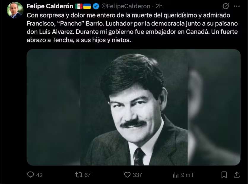 “Con sorpresa y dolor me entero de la muerte del queridísimo y admirado Francisco ‘Pancho’ Barrio. Luchador por la democracia junto a su paisano don Luis Álvarez”, escribió Calderón, al tiempo que envió un abrazo solidario a la familia del exmandatario estatal.