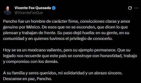 “Se va un gigante, un gigante en la historia de México, un gigante en la historia de la democracia y la libertad”, expresó Fox, quien además destacó que “Pancho” fue un hombre de carácter firme, convicciones claras y un amor genuino por México.