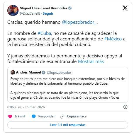 "Gracias, querido hermano @lopezobrador_ . En nombre de Cuba, no me cansaré de agradecer la generosa solidaridad y el acompañamiento de México a la heroica resistencia del pueblo cubano. Y jamás olvidaremos tu permanente y decisivo apoyo al fortalecimiento de esa entrañable amistad", dijo en su cuenta de X.