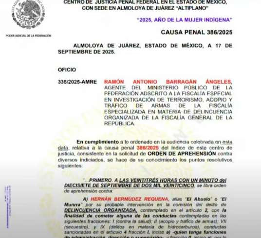 La Fiscalía Especial en Investigación de Terrorismo, Acopio y Tráfico de Armas de la FGR solicitó la noche de ayer la orden de captura contra el presunto líder del grupo criminal "La Barredora", misma que le fue concedida en la causa penal 386/2025.