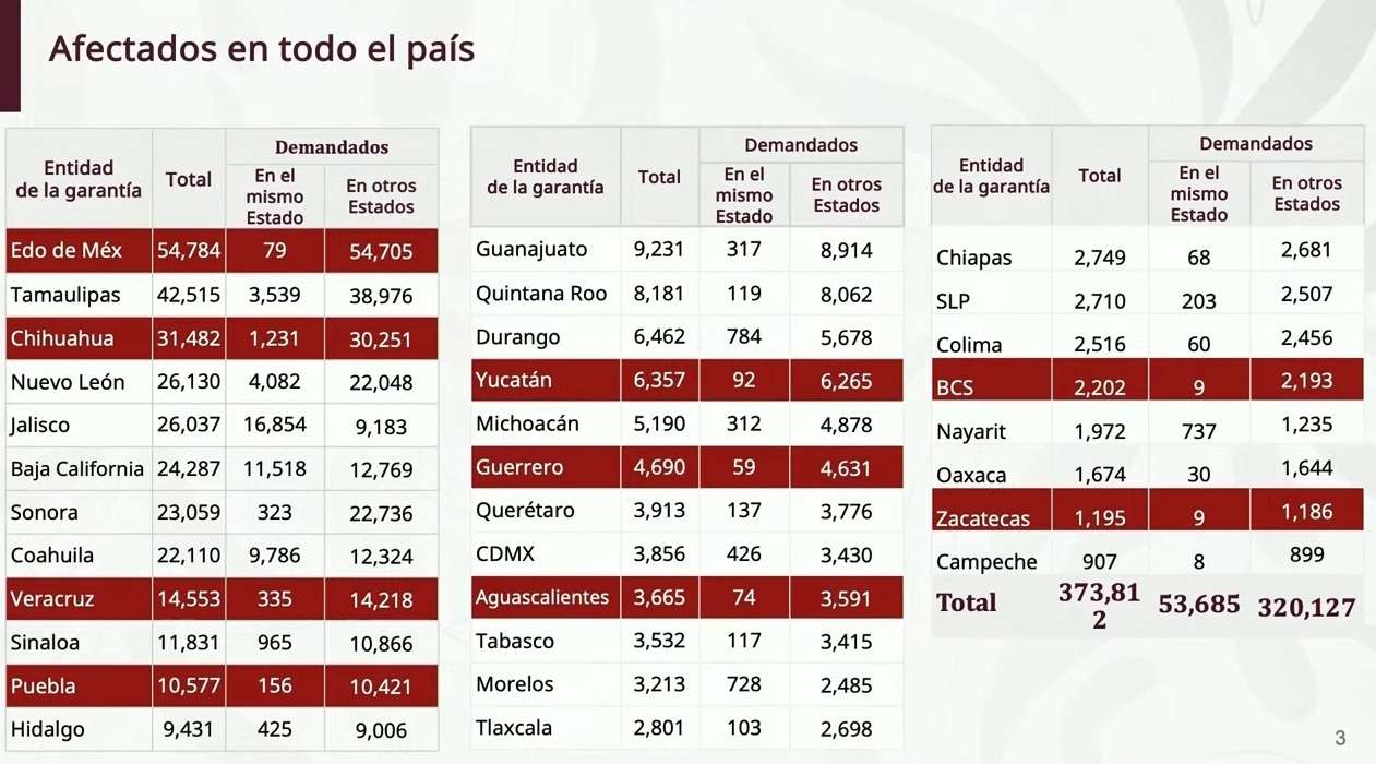Al mismo tiempo, mil 113 personas con créditos en Nayarit fueron demandados en Coahuila, cinco en Jalisco, 14 en la Ciudad de México y 85 en otros estados.