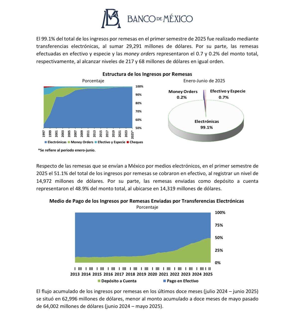 Durante el primer semestre de 2025, el 99.1% del total de ingresos por remesas se realizó a través de transferencias electrónicas, con un monto de 29,291 millones de dólares. Por su parte, las remesas enviadas en efectivo y especie, así como por medio de money orders, representaron el 0.7% y 0.2% del total, respectivamente, al registrar 217 y 68 millones de dólares, en ese orden.