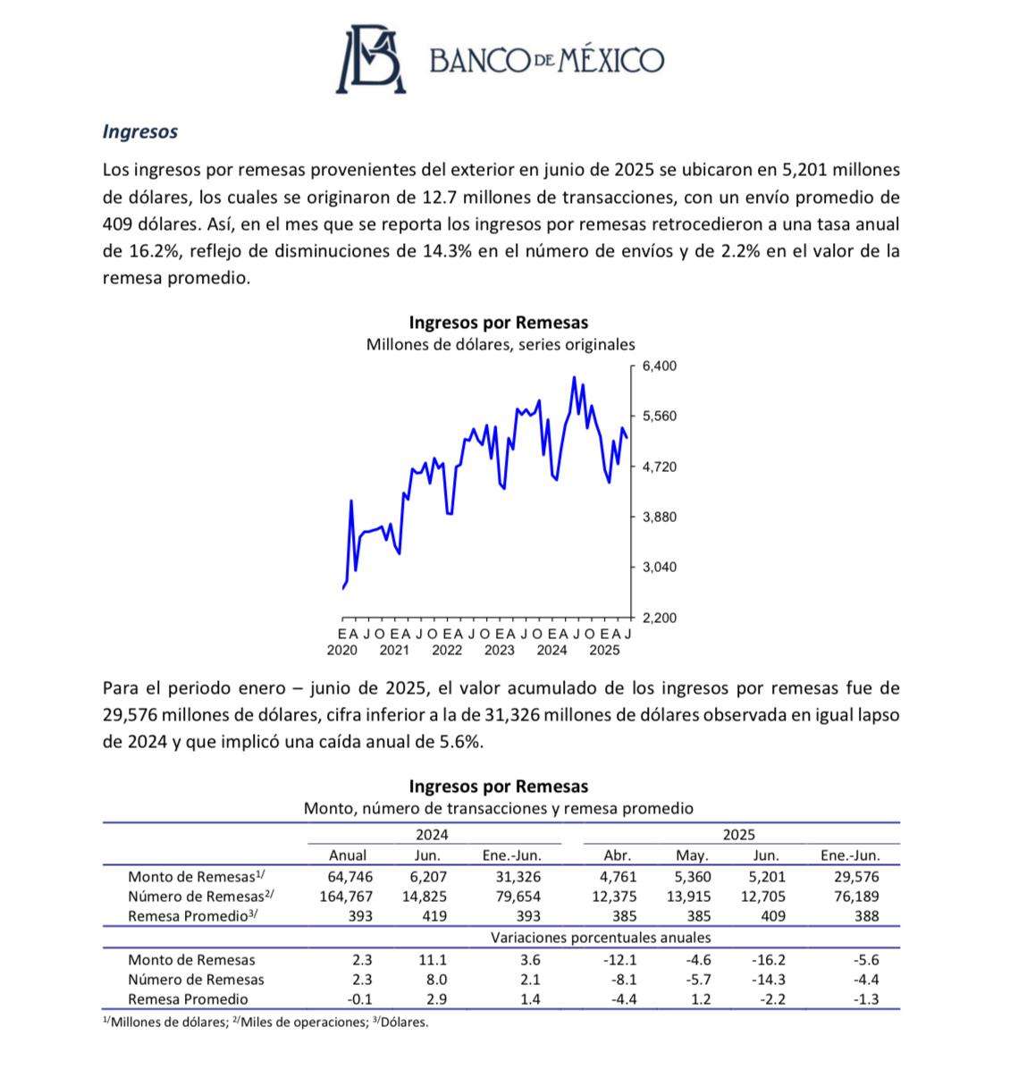 En el periodo de enero a junio de 2025, el valor de los ingresos por remesas fue de 29,576 millones de dólares, cifra inferior a los 31,326 millones reportados en el mismo lapso de 2024, lo que representa una contracción anual del 5.6%.